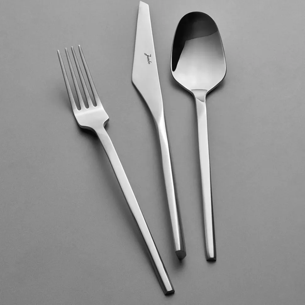 Die geometrischen Oberflächen des Bestecksets erzeugen Lichtreflexionen, die ein glorreiches und glänzendes Aussehen verleihen.