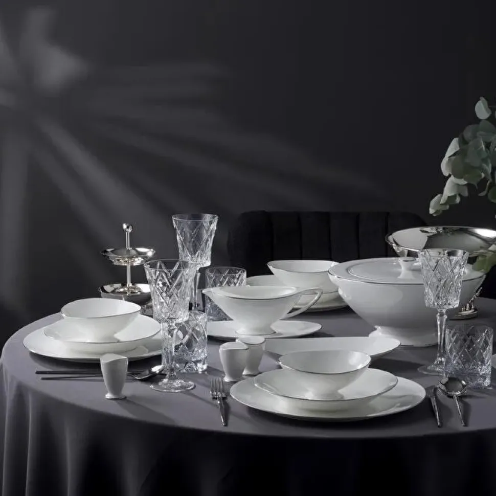 Das Jumbo Moon Platin Tafelservice überzeugt mit seiner 12-Personen-Kapazität, 64 Teilen und einem eleganten Design. Mit seinen runden und ovalen Formen bietet das Set alles, was Sie für Tisch und Service benötigen – von Schalen bis zur Suppenterrine. Das hochwertige Bone China Material sorgt für eine Kombination aus Eleganz und Widerstandsfähigkeit. Ideal für alle, die ein stilvolles und langlebiges Service suchen.
