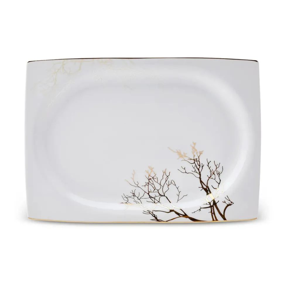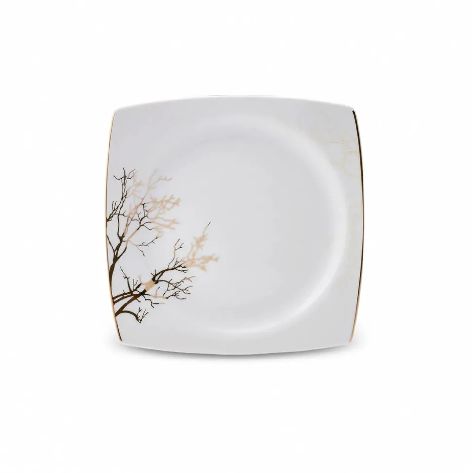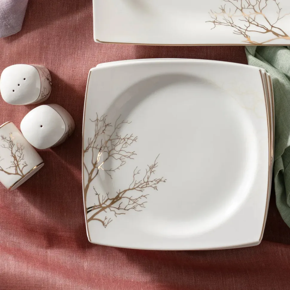 Rund, oval oder eckig? Der Formenvielfalt ist bei Geschirr nahezu keine Grenze gesetzt. Wer geometrische Formen bevorzugt und auch beim Anrichten auf eine klare Anordnung der Speisen Wert legt, wird das 60-teilige Tafelservice für 12 Personen aus der Autumn-Cream-Serie von Karaca lieben. Leicht nach außen gebogene, goldene Kanten, die an den Ecken spitz zusammenlaufen sind das charakteristische Merkmal, dass bei diesem eckigen Kombiservice sofort ins Auge sticht. In Kombination mit den filigranen, goldenen Mustern und Rändern, die an Korallen und Bäume erinnern, ist dieses Porzellan zeitlos und modern zugleich.