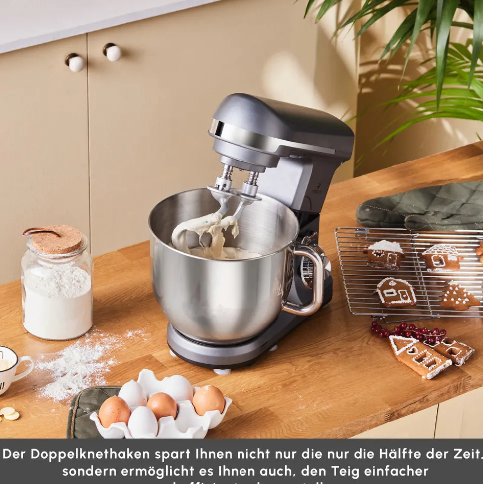 Die 5,7-Liter-Edelstahlkammer mit Griff ist nicht nur langlebig, sondern auch besonders groß. Dank des Doppelhaken-Knetmechanismus kann er 1.500 Gramm Mehl auf einmal kneten oder mit dem Schneebesen 24 Eier gleichzeitig verarbeiten. Dank der sanften Startfunktion werden Spritzer und Mehlstaub verhindert, während der transparente Spritzschutzdeckel für zusätzliche Sicherheit sorgt.