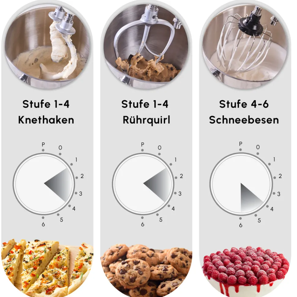 Der Blendburst Standmixer meistert das Rühren, Mischen und Kneten mühelos dank seiner vier verschiedenen Aufsätze. Mit einer 6-stufigen Geschwindigkeitsregelung und einer Leistung von 1400 Watt verarbeitet er selbst aufwendige Mischungen mit Leichtigkeit. Überlastschutz, Überhitzungsschutz und der Impulsmodus sorgen während des gesamten Betriebs für den Schutz der Maschine.