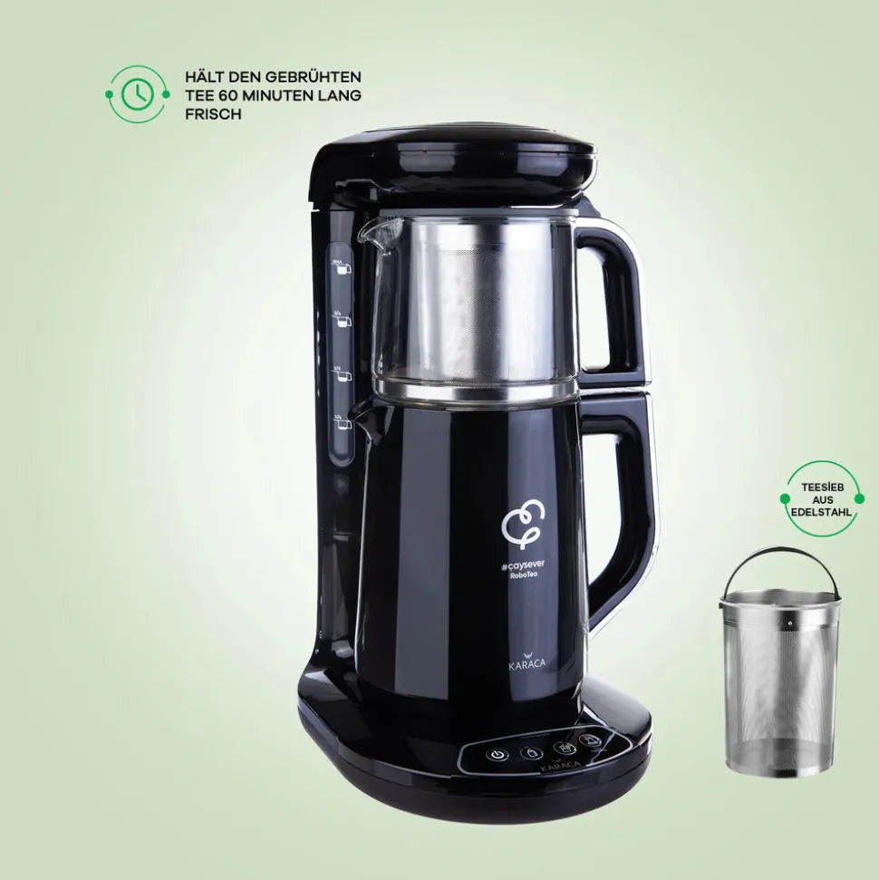 Karaca Caysever Robotea Teemaschine und Wasserkocher mit 2500 Watt Heizleistung in Schwarz mit Akzenten in Chrom