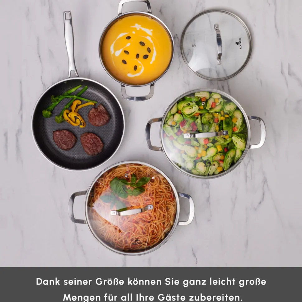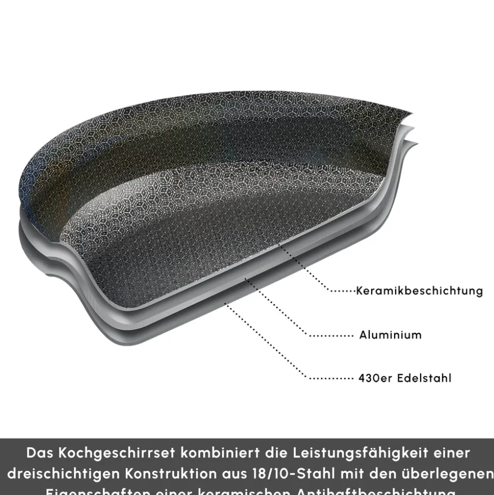 Die innere Keramikschicht bietet höchste Kochleistung – selbst bei minimalem Öl bleibt nichts haften. Die Edelstahl-Außenseite ist langlebig und behält stets ihren Glanz wie am ersten Tag. Die robusten Glasdeckel sind hitze- und stoßfest.