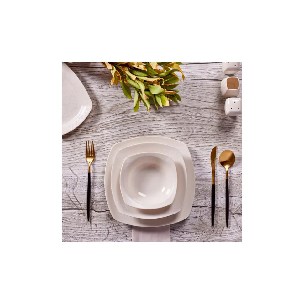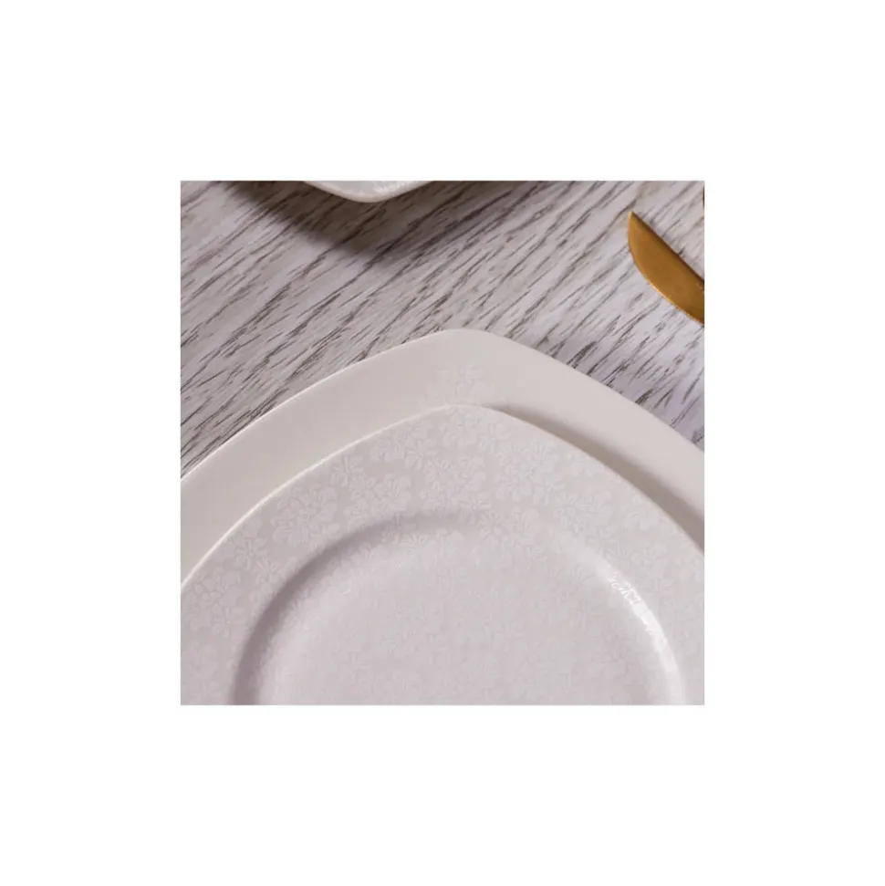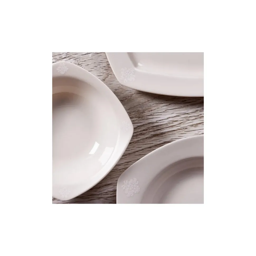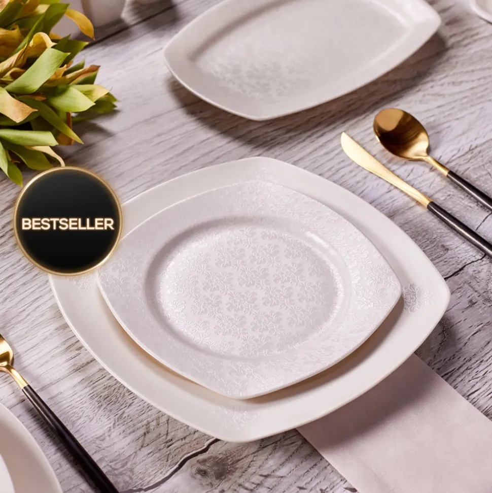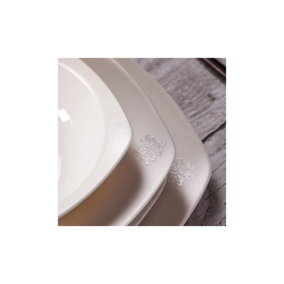Nicht umsonst ist dieses Tafelservice ein Bestseller in unserem Sortiment. Das 57-teilige Geschirrset besticht durch sein außergewöhnliches Design und ein unschlagbares Preis-Leistungs-Verhältnis. Gefertigt aus hochwertigem Porzellan, ist dieses quadratische Geschirr mit abgerundeten Ecken robust und langlebig. Das dezente Dekor mit erhabenem Blumenmuster wertet das Kombiservice optisch auf und wird so zu einem Hingucker auf jeder Tafel.