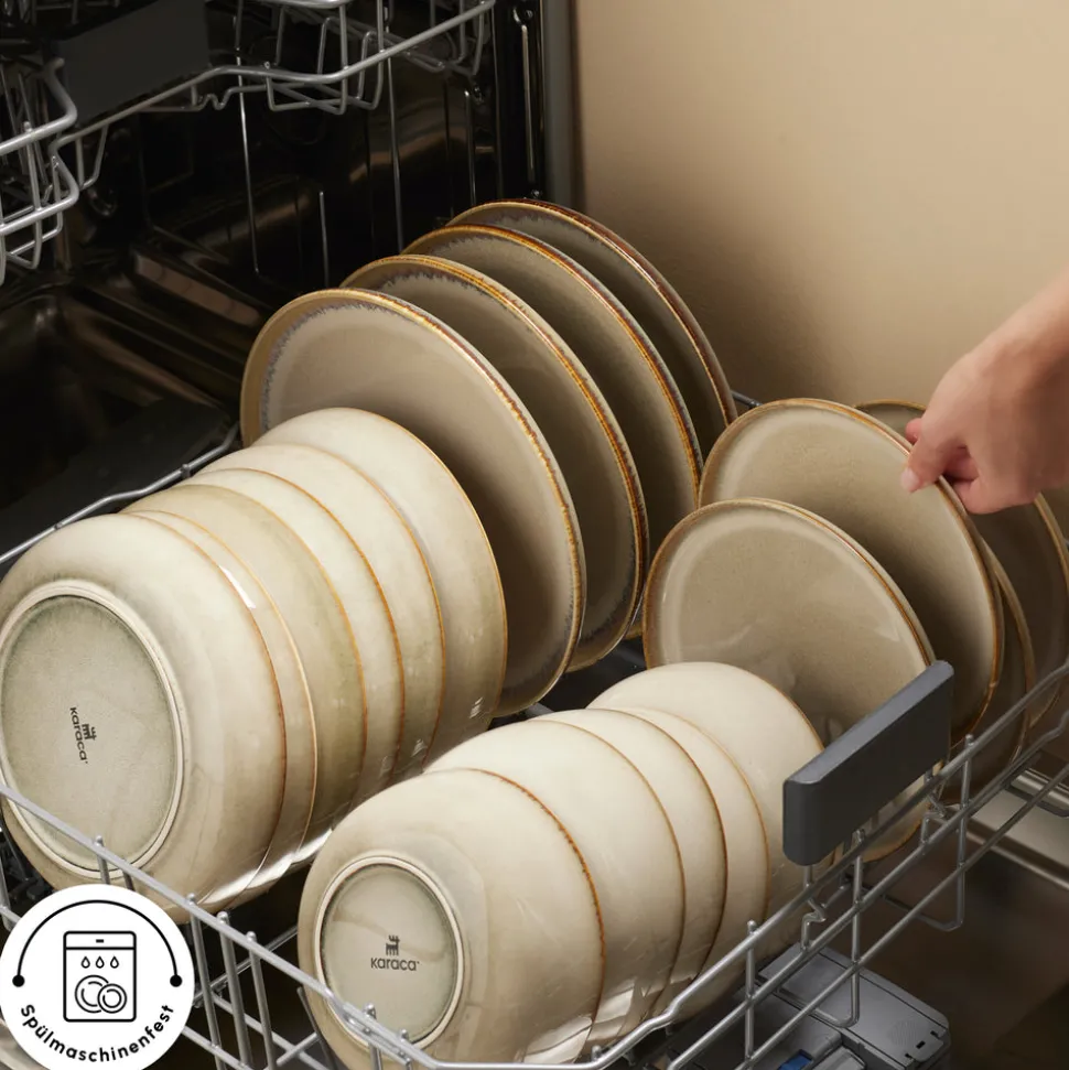 Sie können das Earth Collection Geschirr in der Spülmaschine mit Programmen reinigen, die nicht auf hohe Temperaturen eingestellt sind. Alternativ können Sie die Artikel mit warmem Wasser und mildem Seifenwasser von Hand waschen, was eine einfache Reinigung ermöglicht.