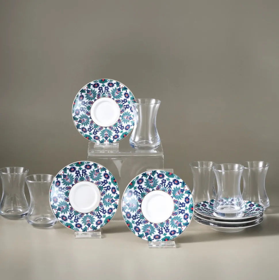 Karaca Edirne 12-teiliges Bone-China Türkisches Teeset für 6 Personen, 130 ml, Mehrfarbig
