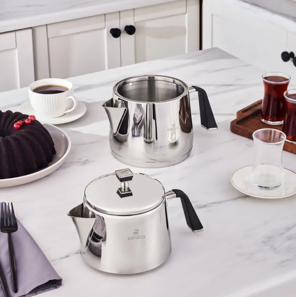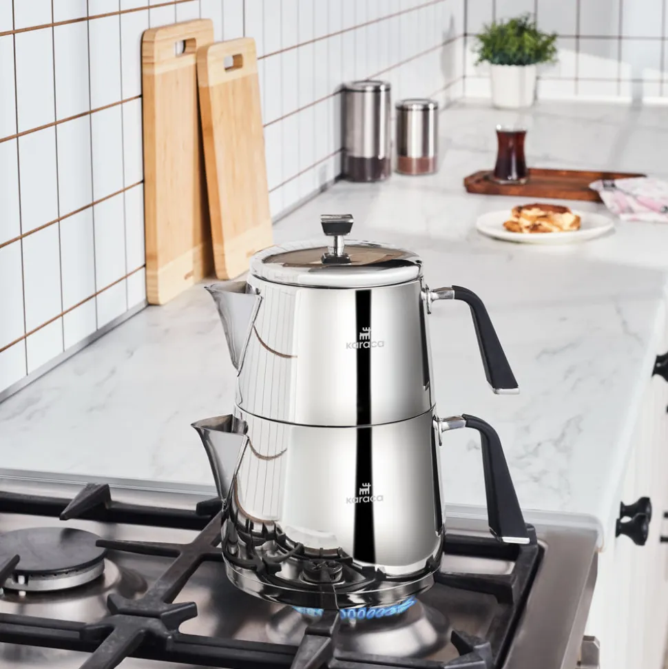 Dank seiner Struktur aus rostfreiem 18/10 Cr-Ni-Stahl ist das Karaca Steel Teapot Set sehr langlebig, gesund und brüht Ihren Tee köstlich auf. Es besteht aus einer 1-Liter-Teekanne und einem 2-Liter-Wasserkocher. Mit seinen brennfreien Griffen lässt sich der Tee leicht servieren. Die Kanne hat eine speziell polierte Oberfläche, damit der Glanz des ersten Tages erhalten bleibt. Er spart Zeit und Energie dank des Kapselbodens, der auf allen Herdarten, auch auf Induktionsherden, die höchste Wärmeübertragung gewährleistet.