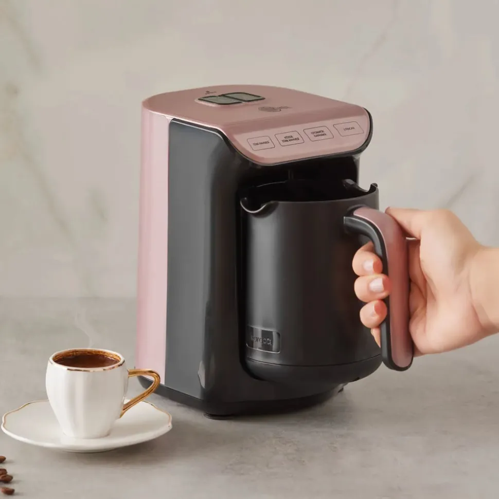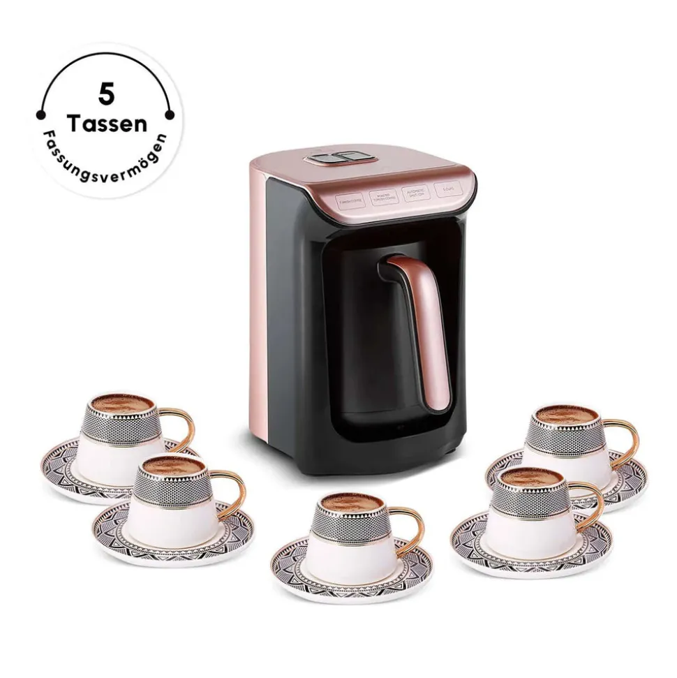 5 Tassen Für schaumigen Kaffee Die Hatir-Serie ist ein Must-have für Liebhaber des türkischen Kaffees und bringt mit dem brandneuen Hatir Köz wieder einmal das wundervolle Aroma von in der Glut gekochtem Kaffee in Ihre Tassen. Mit dem Hatır Köz können Sie in einem Kochvorgang 5 Tassen normalen Türkischen Kaffee oder Türkischen Kaffee mit „Köz“-Aroma (in der Glut gekocht) zubereiten. Dank der automatischen Temperatureinstellung wird der Kaffee mit der richtigen Temperatur, der idealen Konsistenz und genau in der richtigen Zeit gekocht. Dank des speziellen Messlöffels können Sie leicht die Kaffeemenge bestimmen, um einen schön schaumigen türkischen Kaffee zuzubereiten Dank des Überlaufschutzes ist die Verwendung sicher und das Ende des Kochvorgangs wird durch das akustische und optische Signal angezeigt. Dank der Abschaltautomatik schaltet sich das Gerät nach Beendigung des Kochvorgangs selbst aus. Dank der breiten Farbauswahl für jeden Geschmack und jede Küche geeignet. Die Hatır Köz Türkische Kaffeemaschine wird mit einer speziellen Lackiertechnik hergestellt, bei der Farbe mit glänzendem Glitter verwendet wird. Auf diese Weise behält sie ihre Farbe und ihren Glanz für eine lange Zeit. Die Farbabweichungen auf dem Produkt sind ein natürlicher Effekt der Färbetechnik. Karaca Hatir Köz Türkische Kaffeemaschine Karaca Hatir Köz Türkische Kaffeemaschine. Nicht für die Verwendung von Kaffeezutaten wie Milchpulver, Milch, Pulverkaffee etc. geeignet.