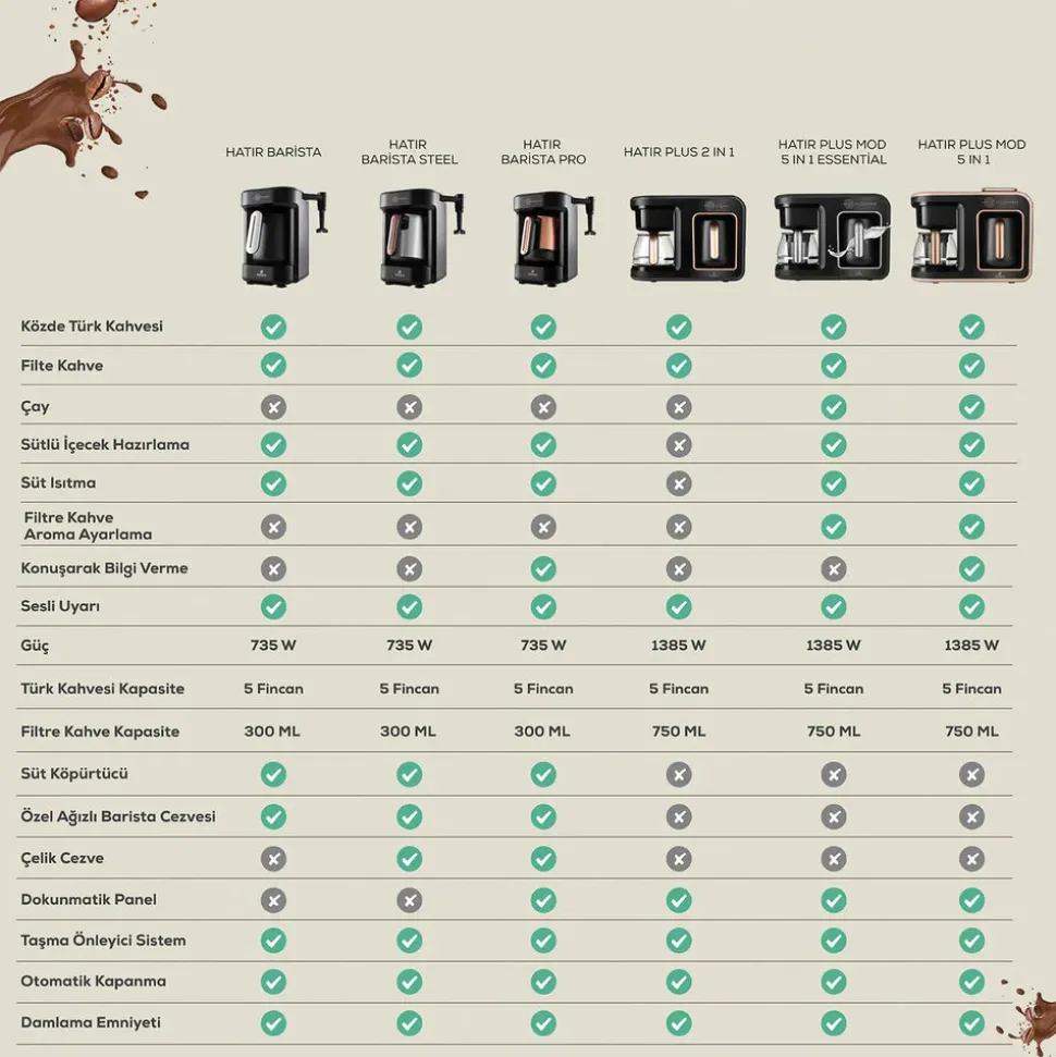 Sie können 5 Tassen Filterkaffee oder Tee in der Glasteekanne aufbrühen und gleichzeitig 5 Tassen gerösteten türkischen Kaffee kochen oder Milchgetränke in der Kaffeekanne zubereiten. Die Hatır Plus Mod 5 in 1 Essential, die 10 Tassen gleichzeitig zubereiten kann, ist ein einziges Produkt, das Ihnen den separaten Kauf einer Teemaschine, einer Filterkaffeemaschine oder einer türkischen Kaffeemaschine erspart!