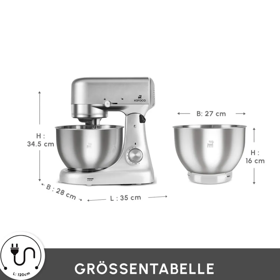 Vor der Reinigung das Gerät ausstecken, abkühlen lassen, mit einem feuchten Tuch und einem milden Reinigungsmittel abwischen, alle abnehmbaren Teile sind von Hand waschbar, nur die Rührschüssel ist spülmaschinenfest.