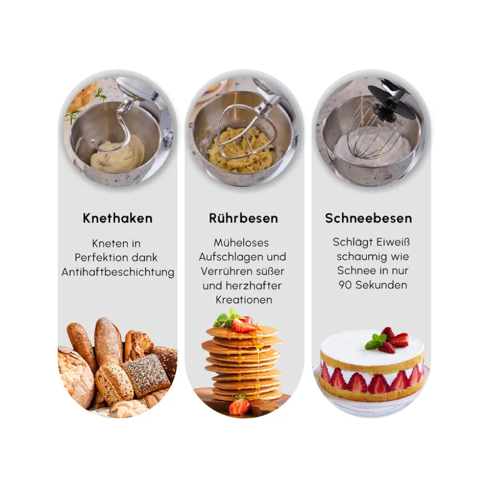 Druckgussformen // Selbststopp-Einstellung, um das Programm abzubrechen oder nach 20 Minuten Betrieb zu stoppen // Planetenrührwerk // Selbstauflaufend (oberes Fach) // Einfaches Einfüllfenster im transparenten Spritzdeckel.