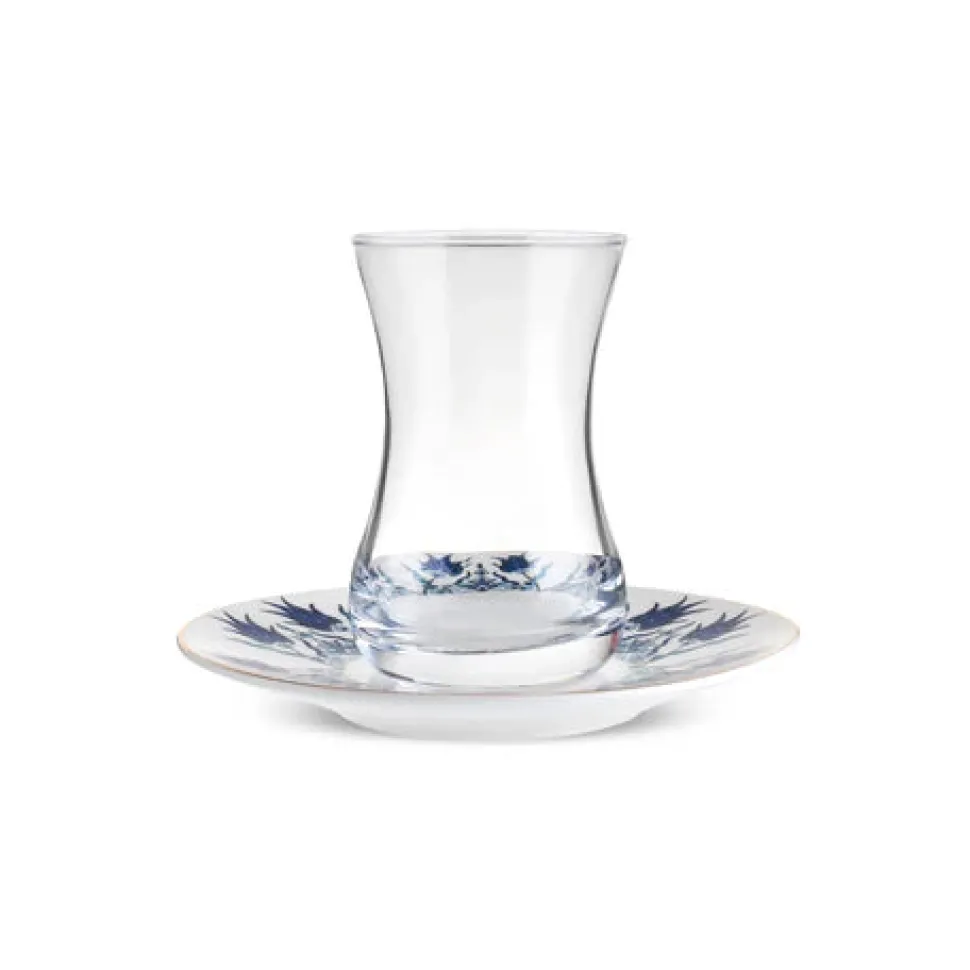 Das Set umfasst sechs transparente Teegläser mit 130 ml Fassungsvermögen sowie sechs Untertassen aus Bone China, verziert mit ausdrucksstarken blauen Motiven. Die Kombination aus Glas und hochwertigem Bone China sorgt für eine elegante Präsentation und langlebige Qualität.