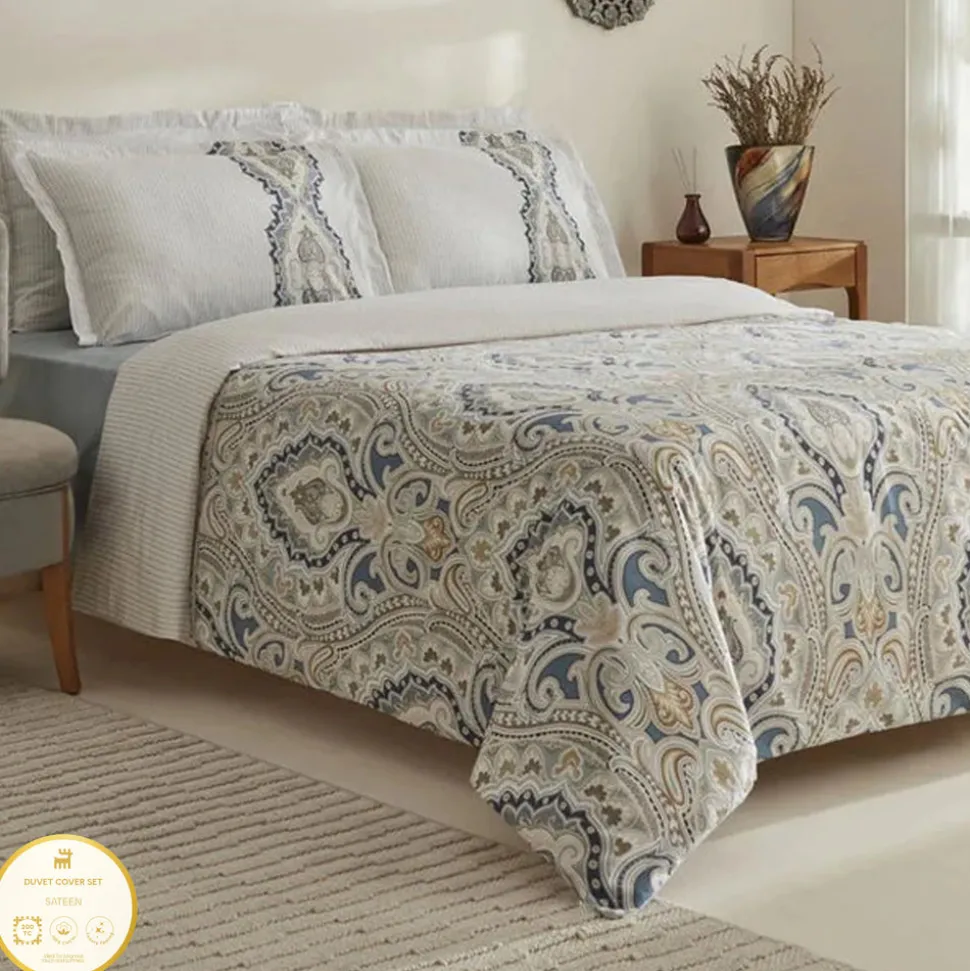 Karaca Lemy Bettwäsche-Set aus 100 % Baumwoll-Satin, Doppelbett, Blau
