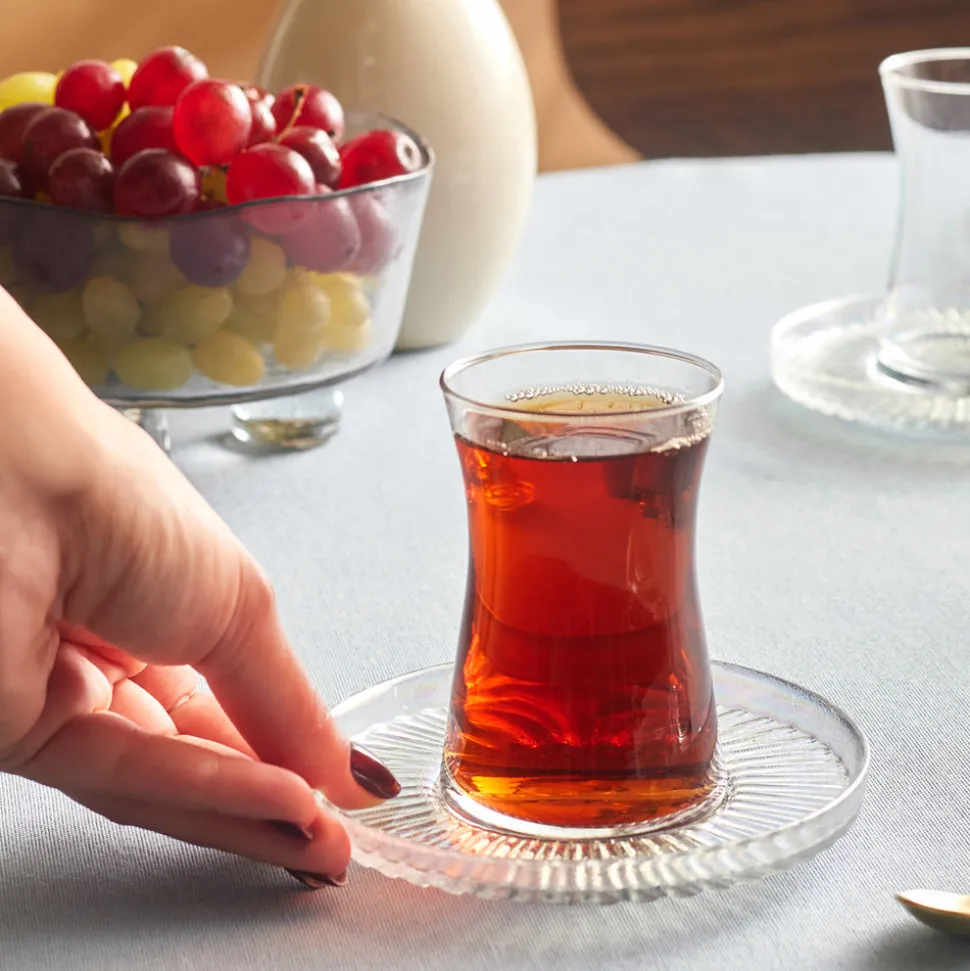 Das Set besteht aus sechs Teegläsern (170 ml) und sechs passenden Untertassen und bietet eine klassische, zugleich elegante Art, türkischen Tee zu servieren. Das klare Glas lässt die intensive Farbe des Tees besonders schön zur Geltung kommen und bereichert das Teezeremoniell.