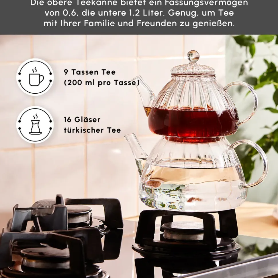 - Die Karaca Lori Glas-Teekanne hat ein Volumen von 0,6-1,2 Litern.