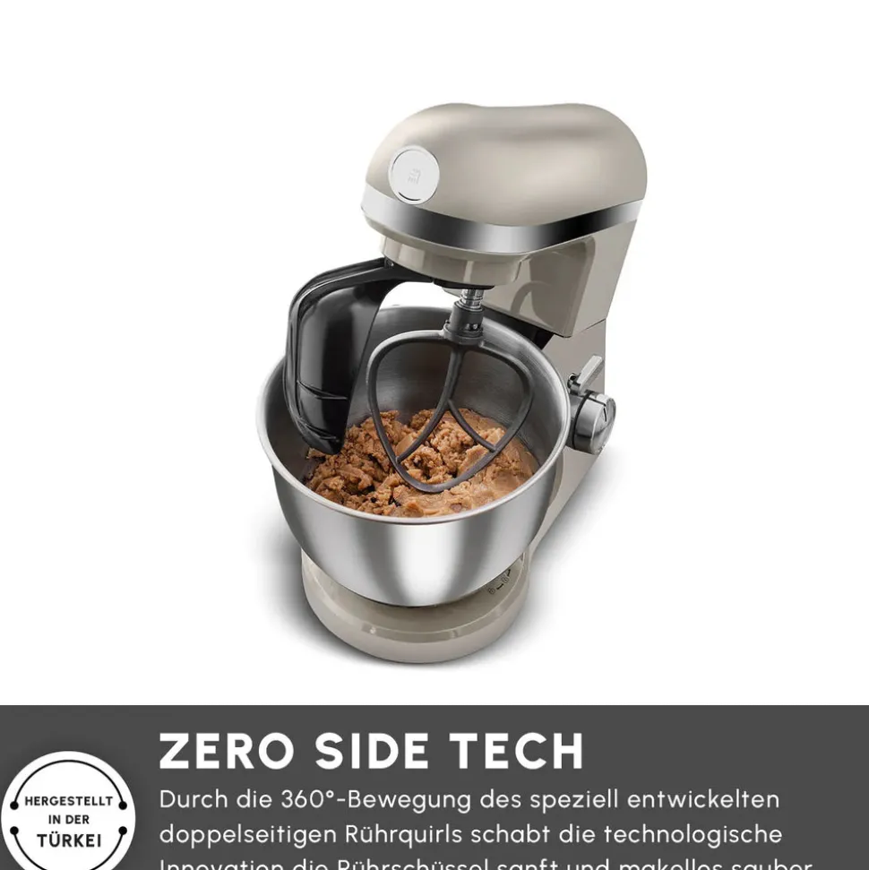 - Zero Side Tech: Sein speziell entwickeltes Doppelarmwerkzeug hinterlässt keine Lebensmittelreste und sorgt für homogene Mischungen.