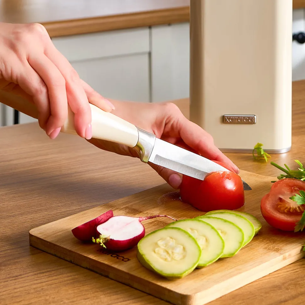 Das 6-teilige Messerset von Karaca ist ein professionelles Messerset, das sowohl die Küche als auch Sie zum Meister macht. Seine scharfen Klingen aus rostfreiem Stahl bieten eine gesunde Nutzung, nicht verlieren ihre Schärfe für viele Jahre. Mit diesem Messerset, das dank seiner Mit diesem Messerset, das dank seiner 5 Messer, die alle mit perfekten ergonomischen Griffen ausgestattet sind, und dem stilvollen Ständer sehr nützlich ist, können Sie in kürzester Zeit alle gewünschten Arbeiten ausführen und köstliche Gerichte zubereiten. Handwäsche wird empfohlen.