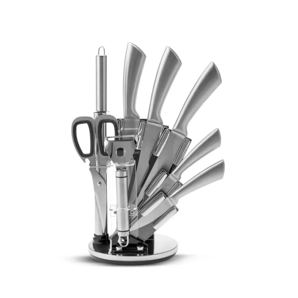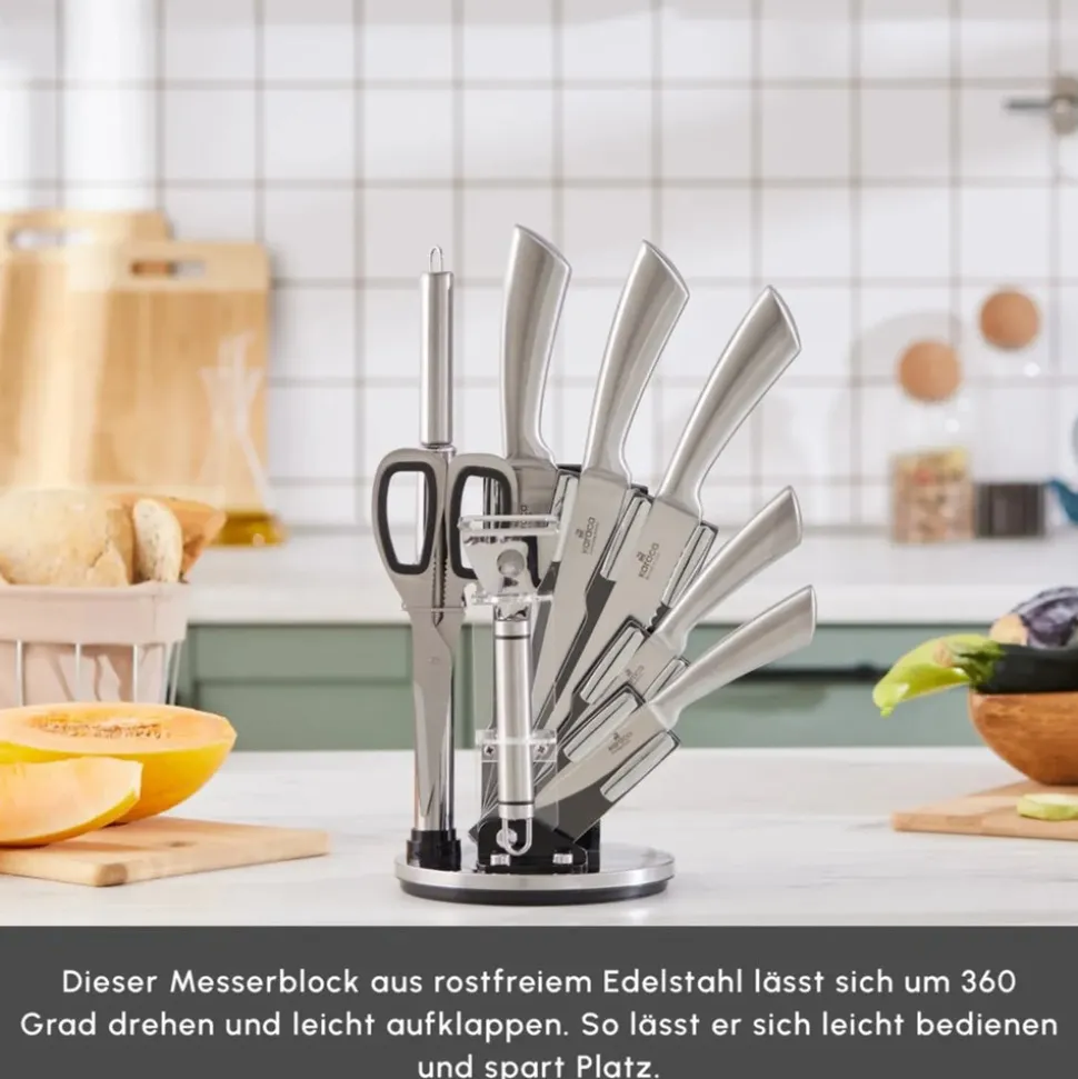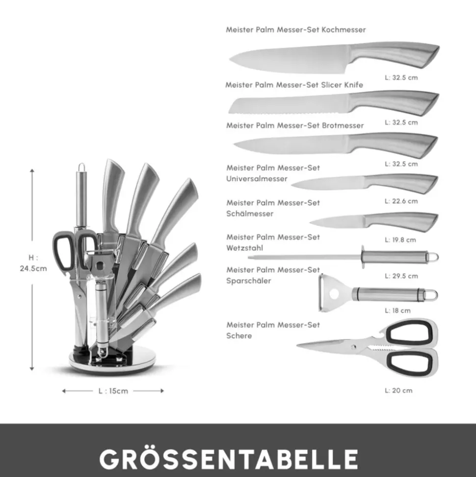 Das Karaca Meister Palm 9-teilige Stahl-Messerset ist aus hochwertigem deutschen Stahl gefertigt, um perfekte Leistungen bei allen Schneide- und Hackaufgaben in Ihrer Küche zu gewährleisten. Dank der überlegenen Materialqualität behält die Edelstahlstruktur des Karaca Meister Palm Messersets ihre Schärfe und ihren Glanz. Dieses umfassende Set umfasst 9 Teile: ein Schneidemesser, ein Hackmesser, ein Schälmesser, ein Kochmesser und ein Brotmesser sowie einen Schäler, einen Schärfer und eine Küchenschere, um all Ihre Bedürfnisse zu erfüllen. Der drehbare und öffnbare Edelstahl-Messerblock bietet eine einfache Handhabung und hilft Platz zu sparen.