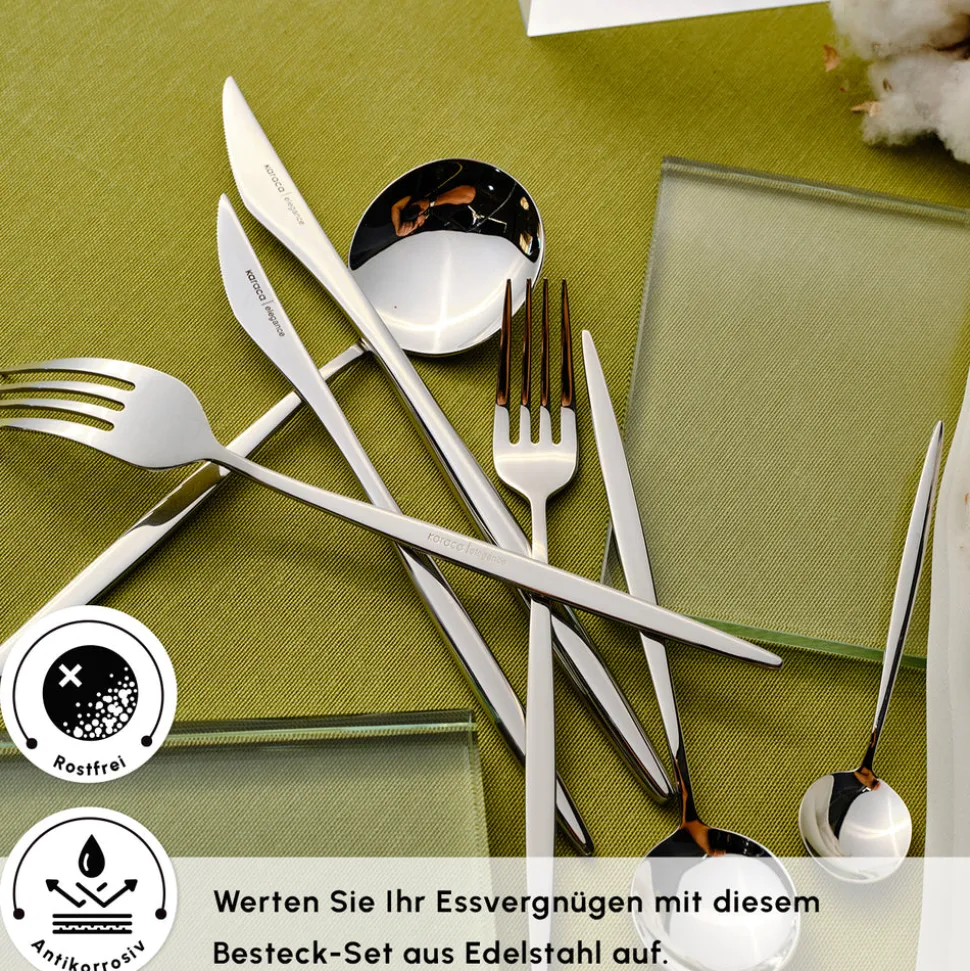 Gefertigt aus 18/10 Edelstahl, bietet dieses Besteck-Set hervorragende Haltbarkeit, eine glänzende Oberfläche und Beständigkeit gegen Anlaufen. Die polierte Silberoberfläche verleiht jeder Tafel Eleganz und macht es zu einer zeitlosen Ergänzung Ihrer Sammlung. Entworfen für Stil und Funktionalität, sorgt es für ein luxuriöses Esserlebnis im Alltag.