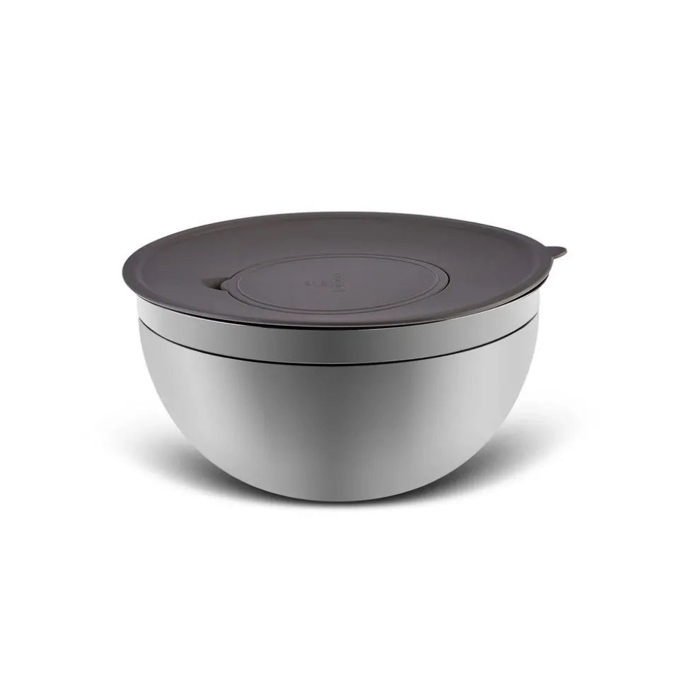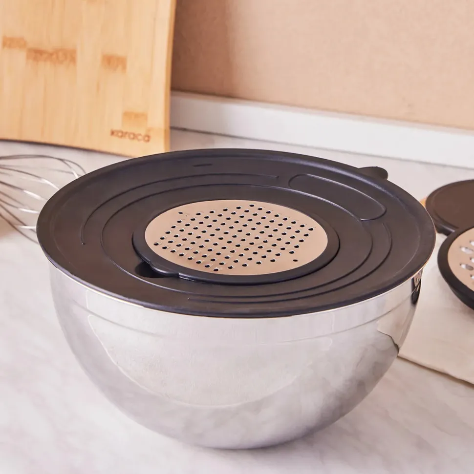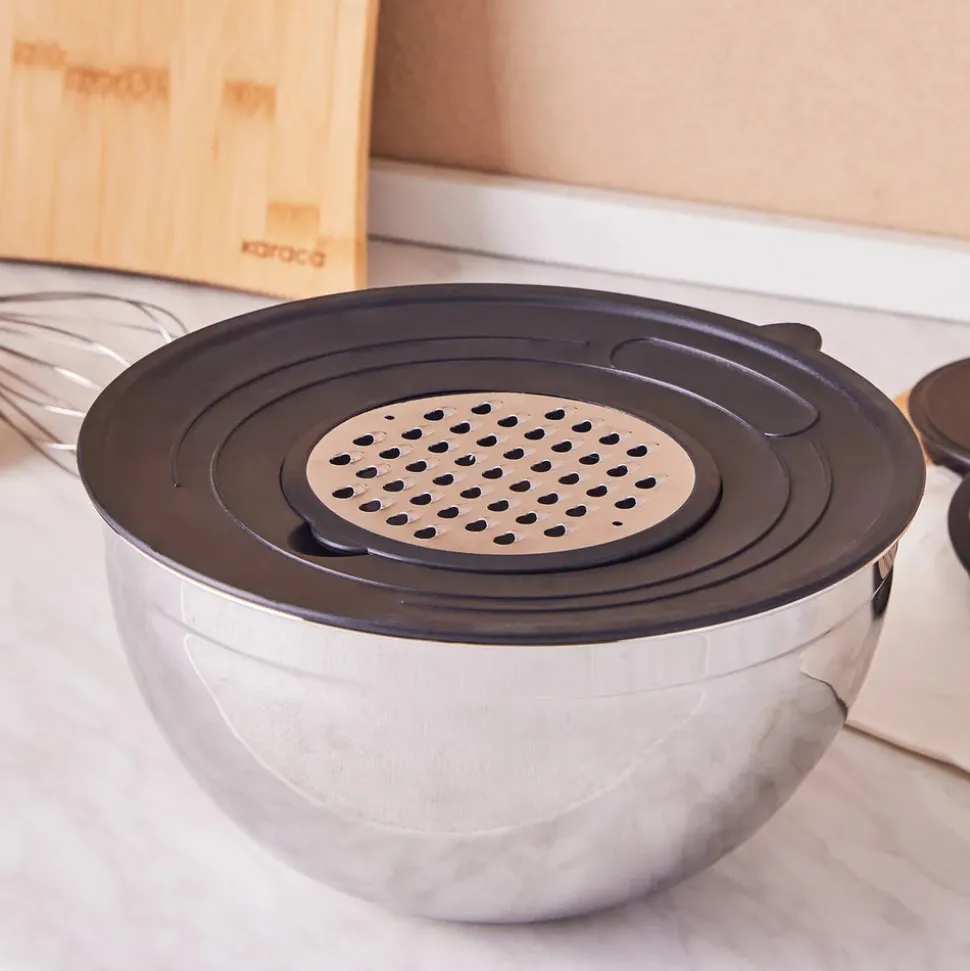 Groyya, ein vielseitiger Misch- und Aufbewahrungsbehälter aus Edelstahl, bietet 3 verschiedene Funktionen in einem Produkt: Reiben, Mischen und Aufbewahren.
