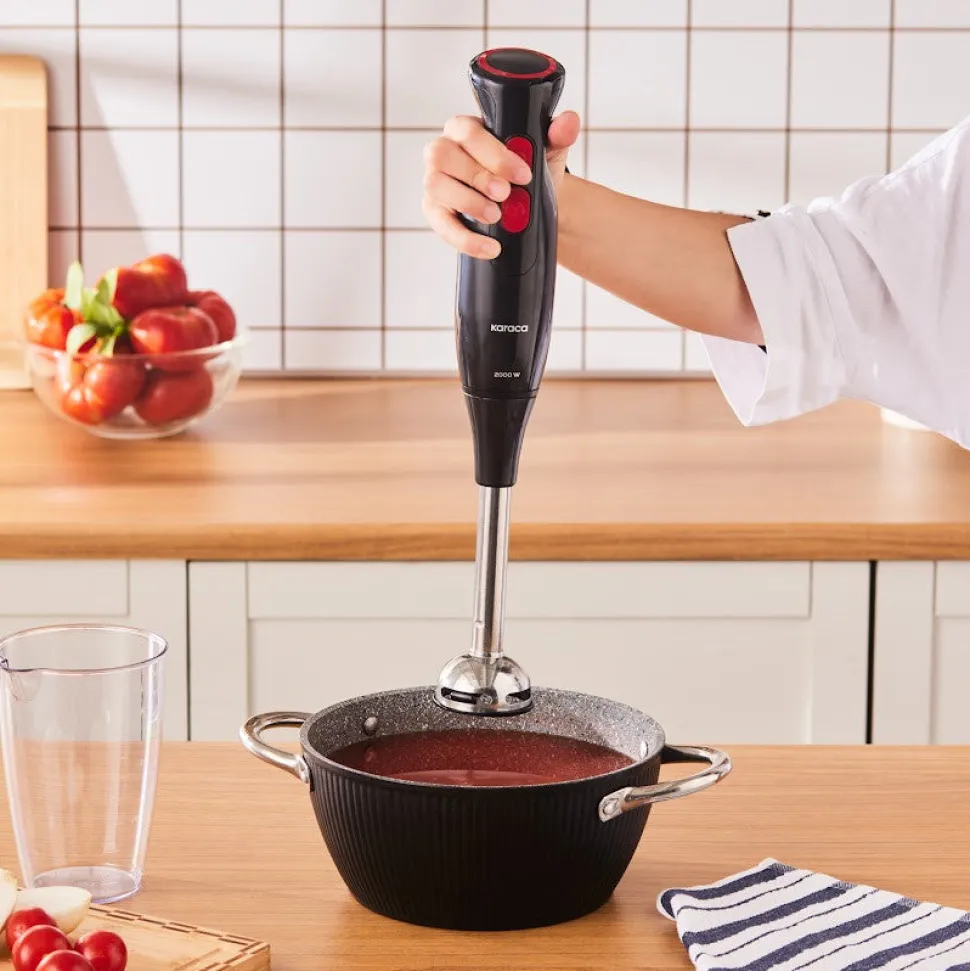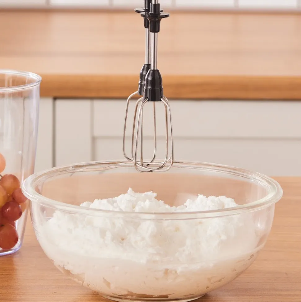 Dank der doppelten Stahlmixeraufsätze können Sie schnell Produkte wie Kuchenteig, Sahne, Babynahrung, Mayonnaise usw. zubereiten.