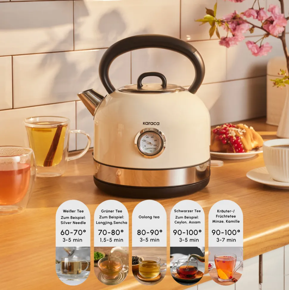 Der Karaca Retro Wasserkocher beschränkt sich nicht nur auf die Aufgabe, Wasser zu erhitzen, sondern bietet auch eine nostalgische Eleganz in der Küche. Dieser Wasserkocher ist darauf ausgelegt, Ihren Bedarf an heißem Wasser schnell und sicher zu decken.