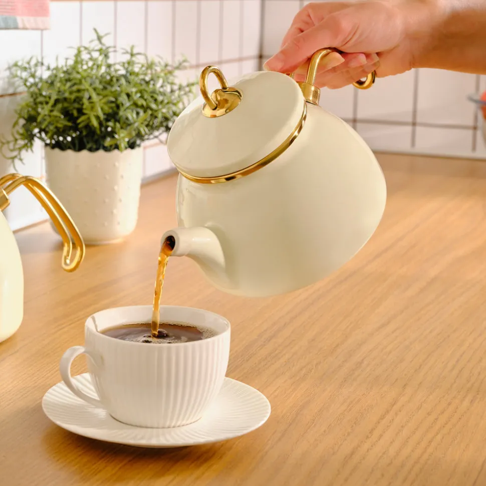 Ihr ansprechendes Äußeres verdankt die Kanne der cremeweiß glänzenden Emaillebeschichtung und den harmonisch abgestimmten goldfarbenen Griffen. Die robuste Oberfläche ist kratzfest und behält ihren Glanz über Jahre hinweg. Durch diese widerstandsfähige Beschichtung wird die Teekanne zudem verlässlich vor Korrosion geschützt und ist äußerst hitzebeständig. Auch aggressive chemische Substanzen können der Beschichtung nichts anhaben. Die besonders glatte Oberfläche ist hygienisch, weil sich dort keine Bakterien ansiedeln. Emaillierungen sind außerdem sehr pflegeleicht und im Handumdrehen zu reinigen. Der schöne cremeweiße Glanz bleibt erhalten und verändert seine gleichmäßige Färbung mit den Jahren nicht.