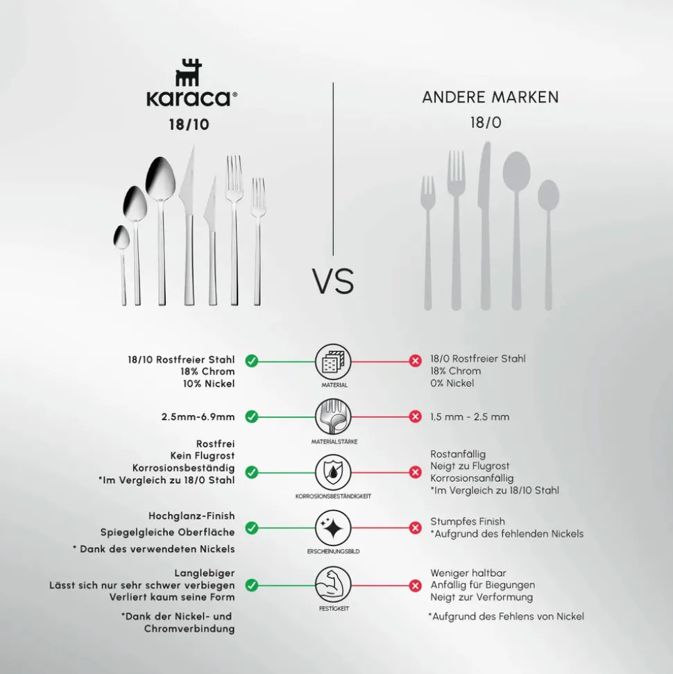 Es besteht aus speziellem rostfreiem Edelstahl 18/10, 304 Cr.Ni., der seinen Glanz für lange Zeit beibehält. Auf diese Weise behält es seine Schärfe für eine lange Zeit. Solange die Gebrauchsempfehlungen befolgt werden, behalten sie ihren Glanz und ihr stilvolles Aussehen wie am ersten Tag.