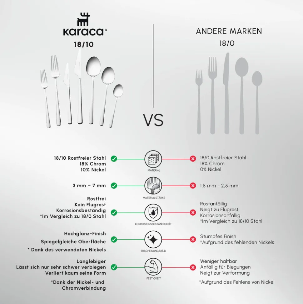 Hergestellt aus hochwertigem 18/10 Edelstahl bietet das Karaca Serena Set außergewöhnliche Haltbarkeit, Rostbeständigkeit und einen polierten Glanz, der lange anhält. Die raffinierte Silberoberfläche verleiht einen modernen Touch und fügt sich nahtlos in sowohl klassische als auch moderne Tischgestaltungen ein.