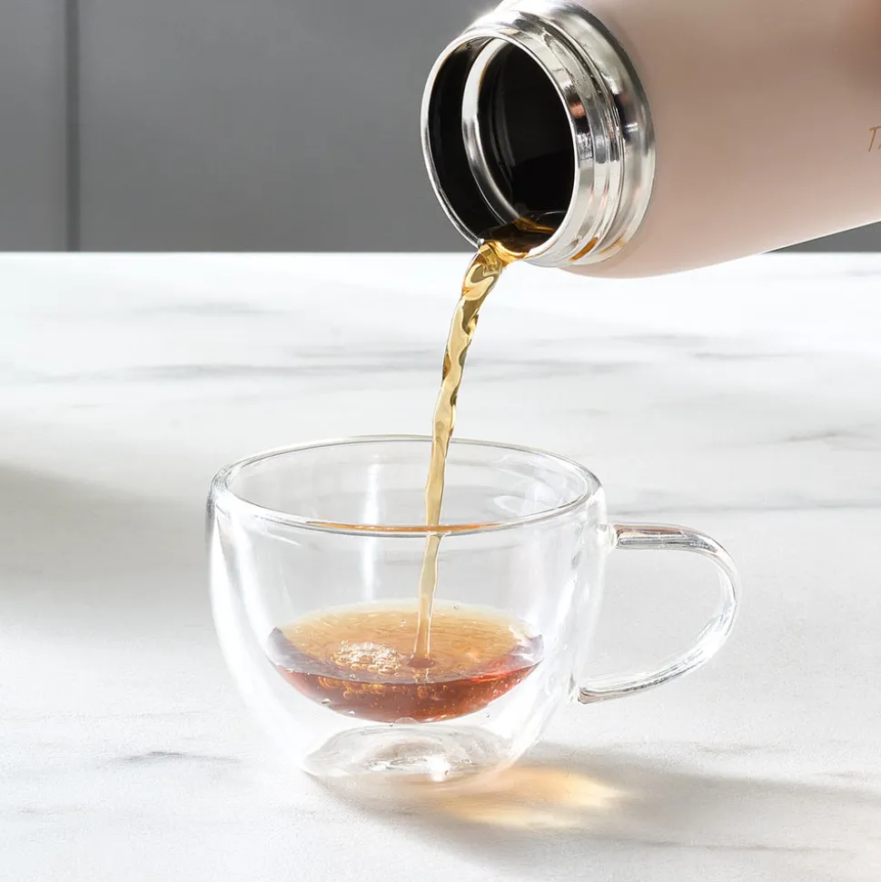 Doppelschichtiger Edelstahl – Hält die ideale Temperatur der Getränke für eine lange Zeit, indem sie die Wärme konserviert.
