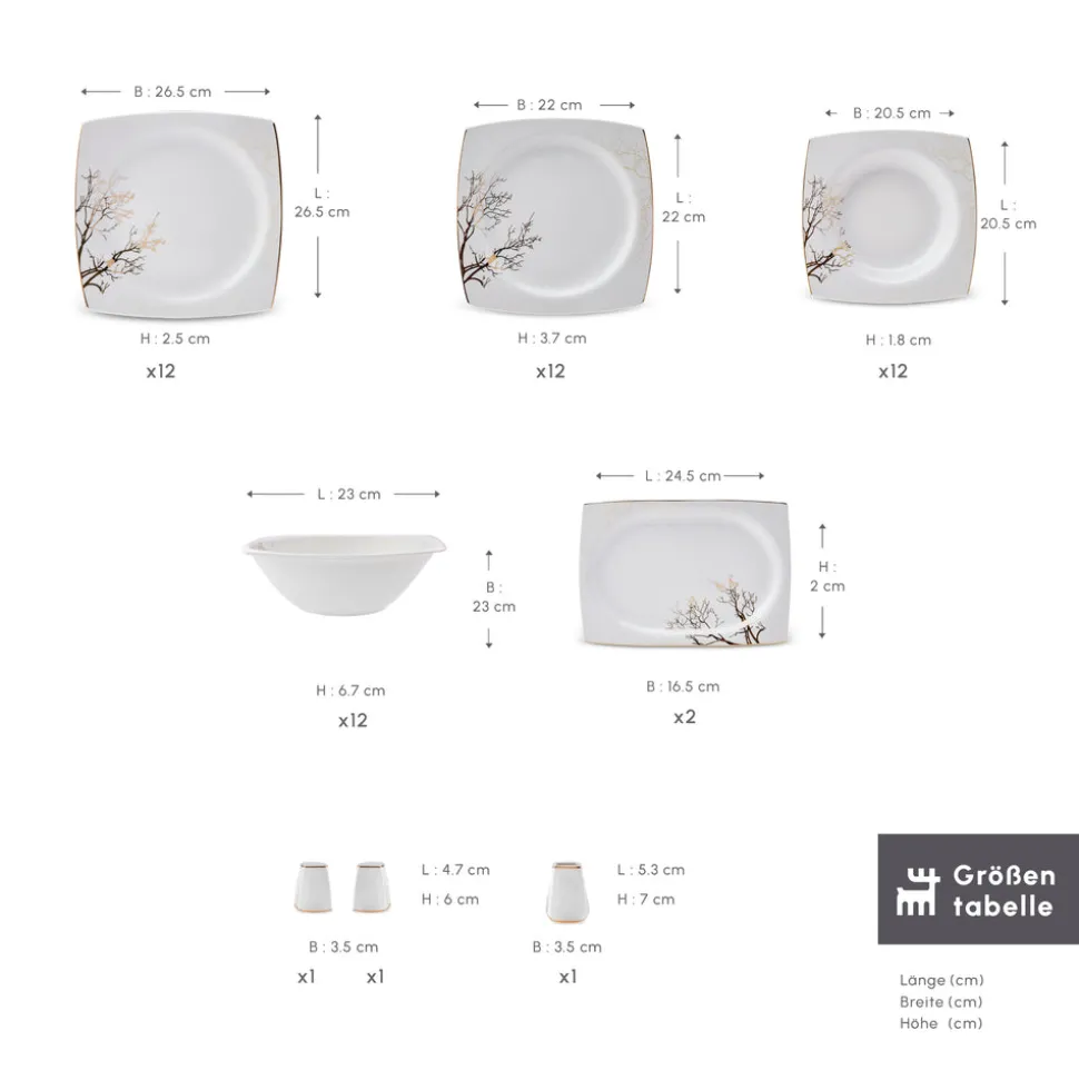 Karaca Square Bone China Autumn 53-teiliges Tafelservice für 12 Personen, Weiß Mehrfarbig