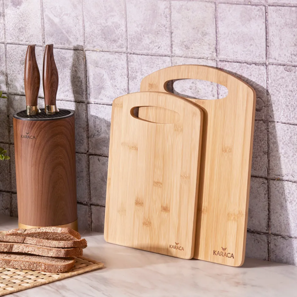 Karaca Stark 2-teiliges Schneidebrett wird in zwei Größen als M und L hergestellt. Die Maße des kleineren Schneidebretts sind 28x20x0,9 cm, während die Maße des größeren Bretts 33x24x0,9 cm betragen. Das messerfreundliche Bambus-Schneidebrett von Stark, das eine dünne, aber sehr hochwertige und solide Struktur hat, ist in Ihren Küchen die reinste Form der Natur! Um eine lange Lebensdauer zu gewährleisten, ist es nicht empfehlenswert, Bambusprodukte in der Spülmaschine zu reinigen. Legen Sie dieses Produkt, das eines der beliebtesten Doppelschneidebrettmodelle ist, jetzt in den Warenkorb, um es nicht zu verpassen!