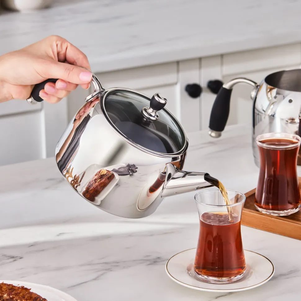 Dank seiner 18/10 Cr-Ni Edelstahlstruktur ist das Karaca Stahl-Teekessel-Set äußerst langlebig, bietet eine gesunde Nutzung und sorgt für köstlich gebrühten Tee. Es besteht aus einer 1-Liter-Teekanne und einem 2-Liter-Wasserkessel. Mit seinen hitzebeständigen Griffen ermöglicht es ein einfaches Einschenken.