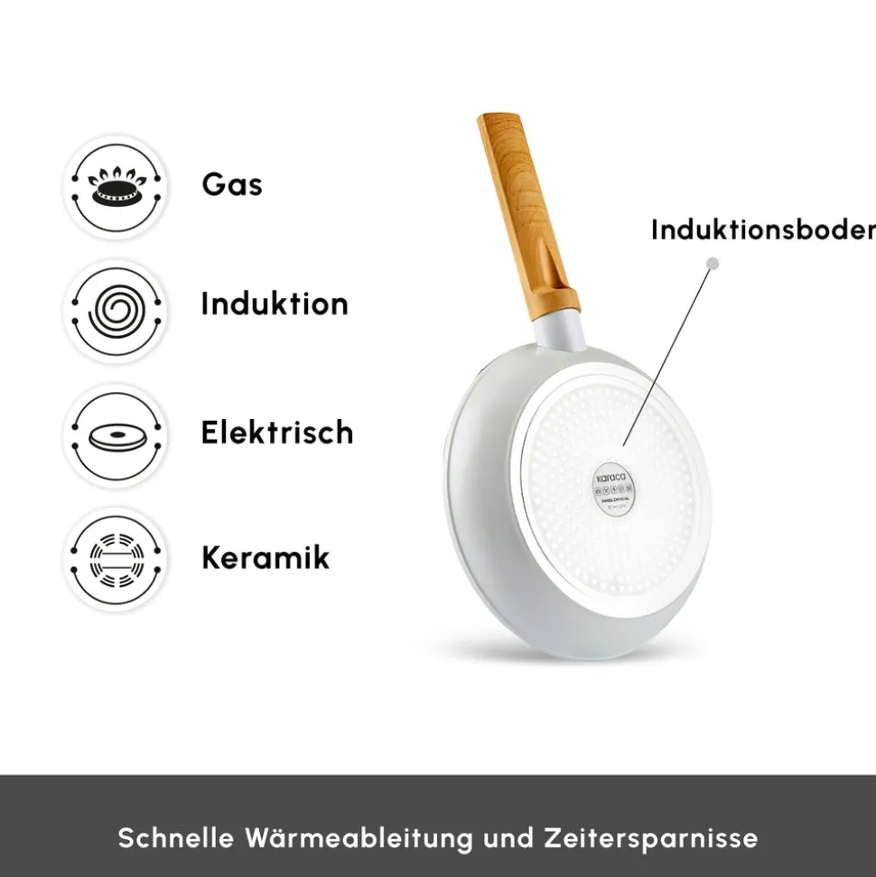 SwissCrystal Pfannenset, das seine Stärke aus der antihaftbeschichteten SwissCrystal Oberfläche bezieht, bietet Ihnen die Möglichkeit, eine Reihe von Gerichten auf