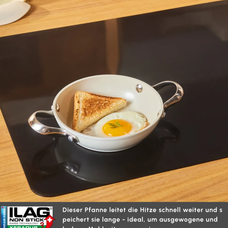 Ein brandneues Pfannenset mit hervorragenden Antihafteigenschaften: SwissCrystal Das Karaca SwissCrystal Pfannenset, das seine Stärke aus der antihaftbeschichteten SwissCrystal Oberfläche bezieht, bietet Ihnen die Möglichkeit, eine Reihe von Gerichten auf praktische Weise zuzubereiten, wie z.B. Eier, Fisch, Hähnchen, und das ganz ohne Öl. Die antihaftbeschichtete Oberfläche wird mit Schweizer Kristallen hergestellt und enthält keine gesundheitsgefährdenden chemischen Verbindungen wie „PFAS“, die die Gesundheit beeinträchtigen. Zudem ist das SwissCrystal Pfannenset leicht zu reinigen! Egal, welches Gericht Sie zubereitet haben, es genügt, es kurz unter Wasser zu halten. Die essentiellen und praktischen Eigenschaften des SwissCrystal Pfannensets erleichtern Ihnen die Zubereitung schmackhafter Gerichte und sorgen für eine einfache Handhabung in Ihrer Küche.