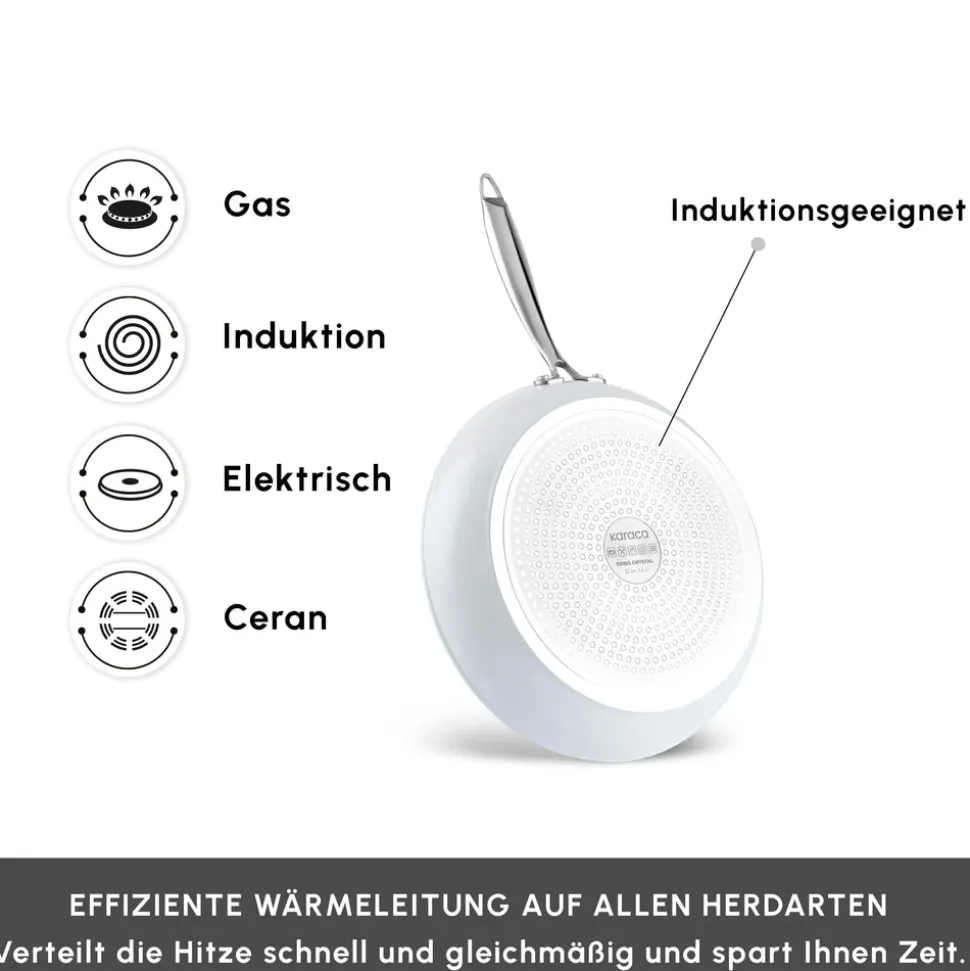 Das Karaca SwissCrystal Pfannenset, das seine Stärke aus der antihaftbeschichteten SwissCrystal-Oberfläche bezieht, ermöglicht Ihnen die praktische Zubereitung verschiedenster Gerichte – wie Eier, Fisch und Hähnchen – ganz ohne Öl. Die Antihaftbeschichtung wird mit Schweizer Kristallen hergestellt und enthält keine gesundheitsschädlichen Chemikalien wie PFAS.