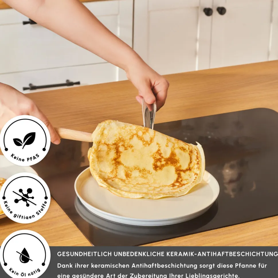 Ein brandneues Pfannenset mit hervorragenden Antihafteigenschaften: SwissCrystal Das Karaca SwissCrystal Pfannenset, das seine Stärke aus der antihaftbeschichteten SwissCrystal Oberfläche bezieht, bietet Ihnen die Möglichkeit, eine Reihe von Gerichten auf praktische Art und Weise zuzubereiten, wie z.B. Eier, Fisch, Hühnchen, und das ganz ohne Öl. Die antihaftbeschichtete Oberfläche wird mit Schweizer Kristallen hergestellt und enthält keine gesundheitsgefährdenden chemischen Verbindungen wie „PFAS“, die die Gesundheit beeinträchtigen. Zudem ist das SwissCrystal Pfannenset leicht zu reinigen! Egal, welches Gericht Sie zubereitet haben, es genügt, es kurz unter Wasser zu halten. Die essentiellen und praktischen Eigenschaften des SwissCrystal Pfannensets
