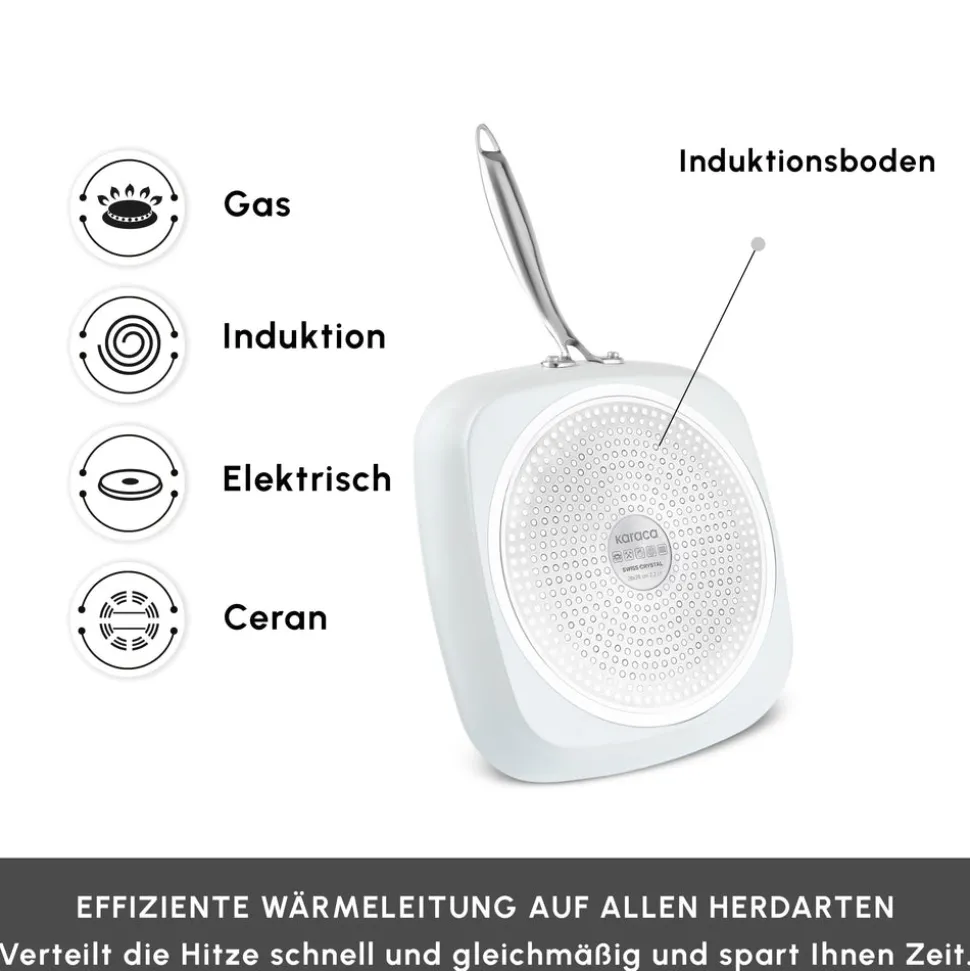 Ein brandneues Pfannenset mit hervorragenden Antihafteigenschaften: SwissCrystal Das Karaca SwissCrystal Pfannenset, das seine Stärke aus der antihaftbeschichteten SwissCrystal Oberfläche bezieht, bietet Ihnen die Möglichkeit, eine Reihe von Gerichten auf praktische Weise zuzubereiten, wie z.B. Eier, Fisch, Hähnchen, und das ganz ohne Öl. Die antihaftbeschichtete Oberfläche wird mit Schweizer Kristallen hergestellt und enthält keine gesundheitsgefährdenden chemischen Verbindungen wie „PFAS“, die die Gesundheit beeinträchtigen. Zudem ist das SwissCrystal Pfannenset leicht zu reinigen! Egal, welches Gericht Sie zubereitet haben, es genügt, es kurz unter Wasser zu halten. Die essentiellen und praktischen Eigenschaften des SwissCrystal Pfannensets erleichtern Ihnen die Zubereitung schmackhafter Gerichte und sorgen für eine einfache Handhabung in Ihrer Küche.