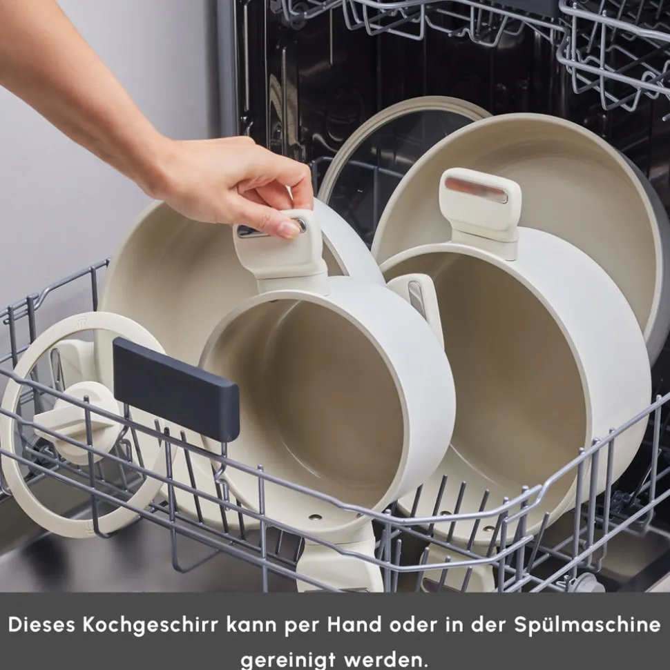 Sie können es auch in der Spülmaschine reinigen. Um die Antihafteigenschaften und die Kratzfestigkeit zu erhalten, empfehlen wir die Verwendung von