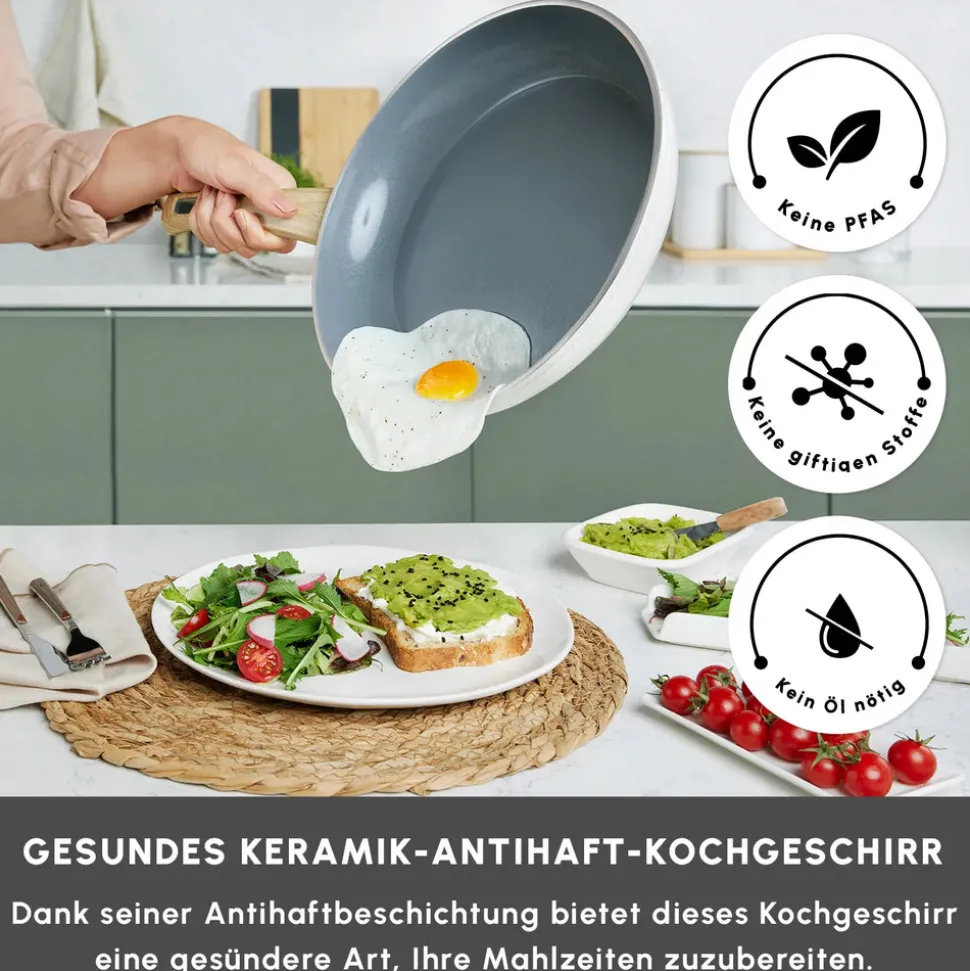 Enthält keine PFAS und schädlichen Chemikalien: Die Antihaft-Oberfläche aus Schweizer Kristallen enthält keine schädlichen Chemikalien wie „PFAS“, die die menschliche Gesundheit gefährden.