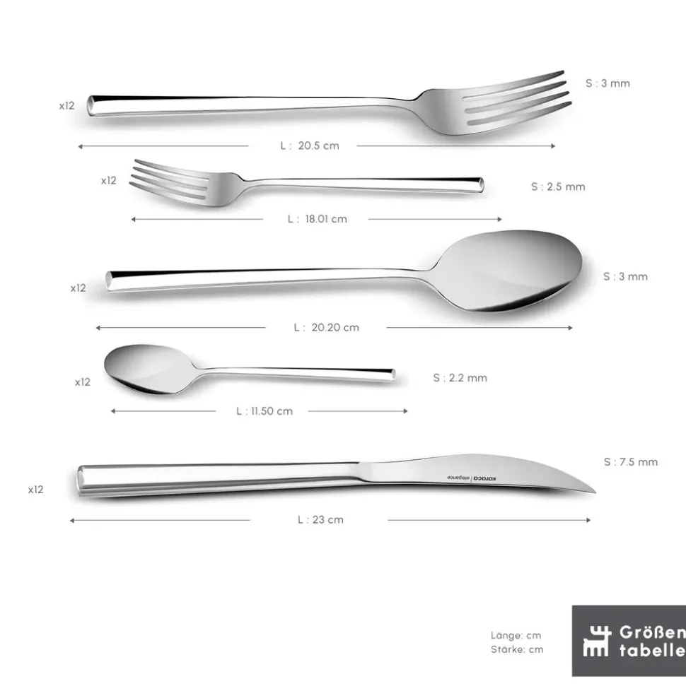 In den 60 Teilen des Sets ist alles enthalten, was Sie für ein opulentes Mahl an Tafelbesteck benötigen. Esslöffel für die Suppe, Messer und Gabeln für den Hauptgang, Dessertgabeln für den süßen Nachtisch und Teelöffel für den Kaffee zum Abschluss des Menüs. Damit können Sie 12 Personen rund herum kulinarisch verwöhnen.