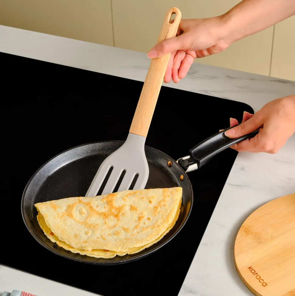 Jedes Teil besteht aus hitzebeständigem Silikon und natürlichem Buchenholzgriff, schützt Ihre Töpfe und Pfannen vor Kratzern und sorgt für eine komfortable, langlebige Nutzung. Inspiriert von Refika Birgüls Küche, verbindet das Design Praktikabilität mit Stil.