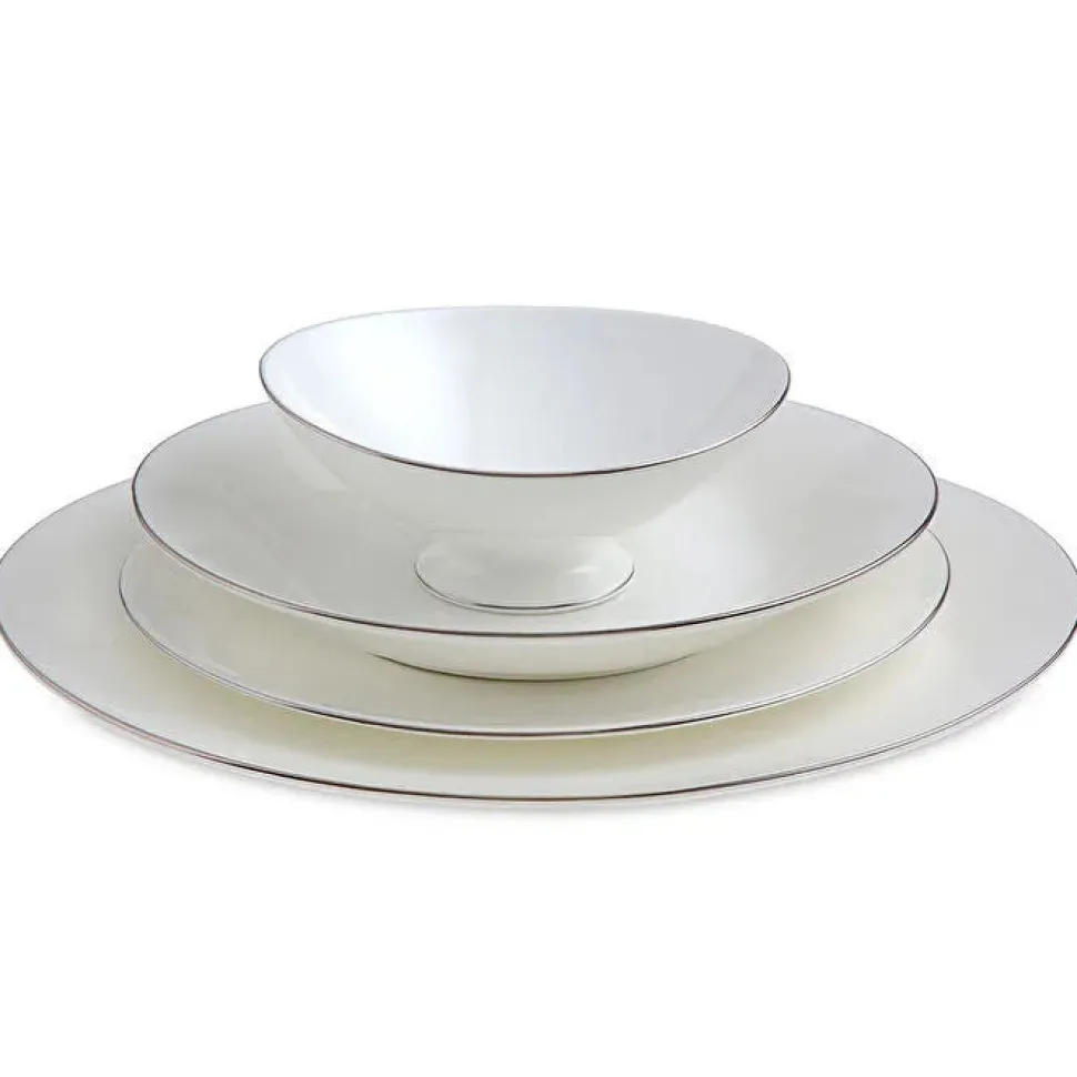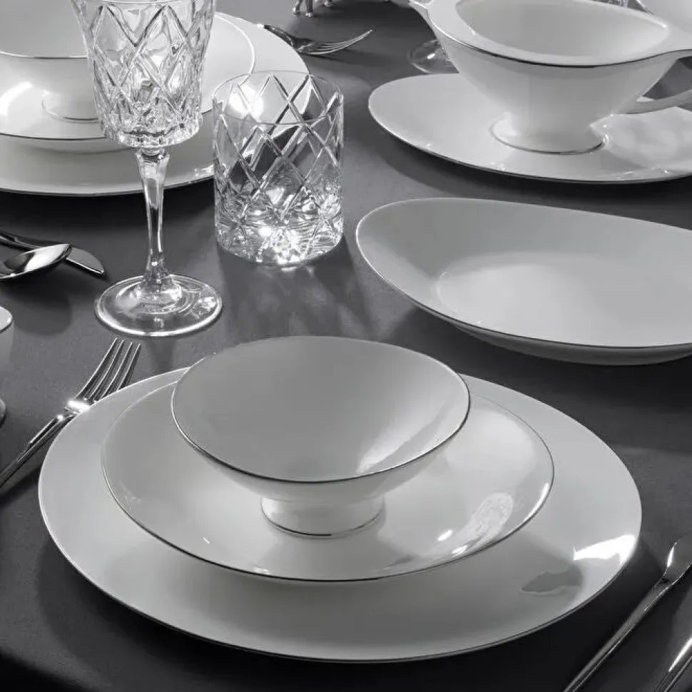 Das Jumbo Moon Platin Tafelservice überzeugt mit seiner 12-Personen-Kapazität, 64 Teilen und einem eleganten Design. Mit seinen runden und ovalen Formen bietet das Set alles, was Sie für Tisch und Service benötigen – von Schalen bis zur Suppenterrine. Das hochwertige Bone China Material sorgt für eine Kombination aus Eleganz und Widerstandsfähigkeit. Ideal für alle, die ein stilvolles und langlebiges Service suchen.