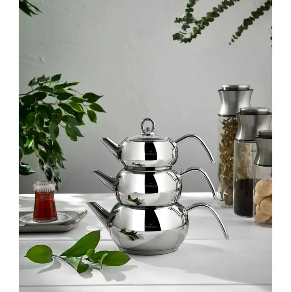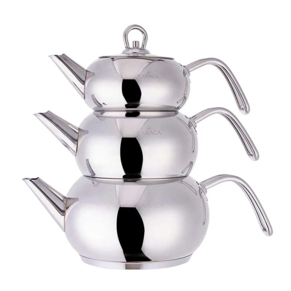 Wie wäre es mit einer anderen Teekanne mit Karaca 3D Teekannen-Set … Im Gegensatz zu den Klassikern behält die 3D-Teekanne, die all jenen gefallen wird, die verschiedene Stile und Designs mögen, ihren Glanz für eine lange Zeit bei. Wenn Sie viele Gäste bewirten, können Sie mit dieser Teekanne den Tee schneller servieren und es gibt keine Probleme, wie z. B. dass der Tee oder das Wasser ausgeht. Wenn Sie Tee für eine große Gruppe von Gästen zubereiten, können Sie den Tee im mittleren Teil aufbrühen und den Bedarf an heißem Wasser im unteren und oberen Behälter decken. Er hat ergonomische Griffe und lässt sich leicht von einem Ort zum anderen bewegen. Sie verfügt über einen Boden mit Hitzeschutzfunktion.