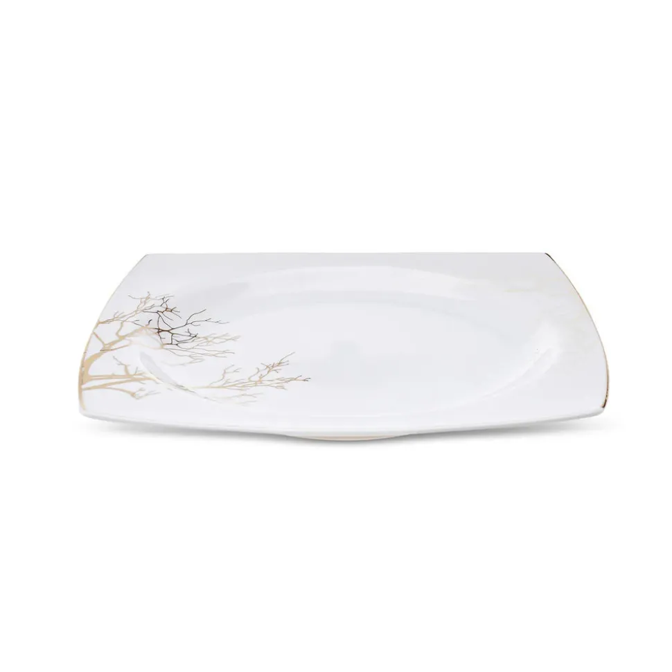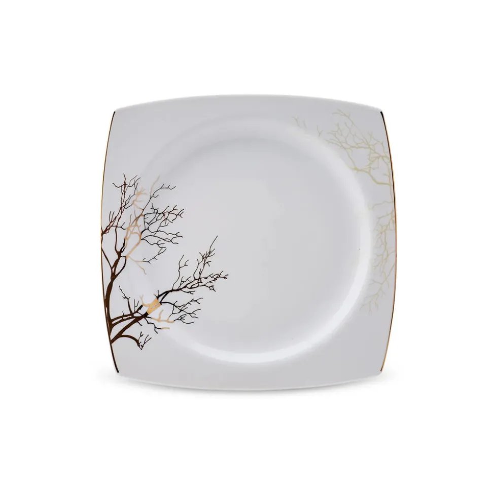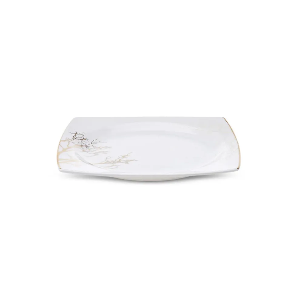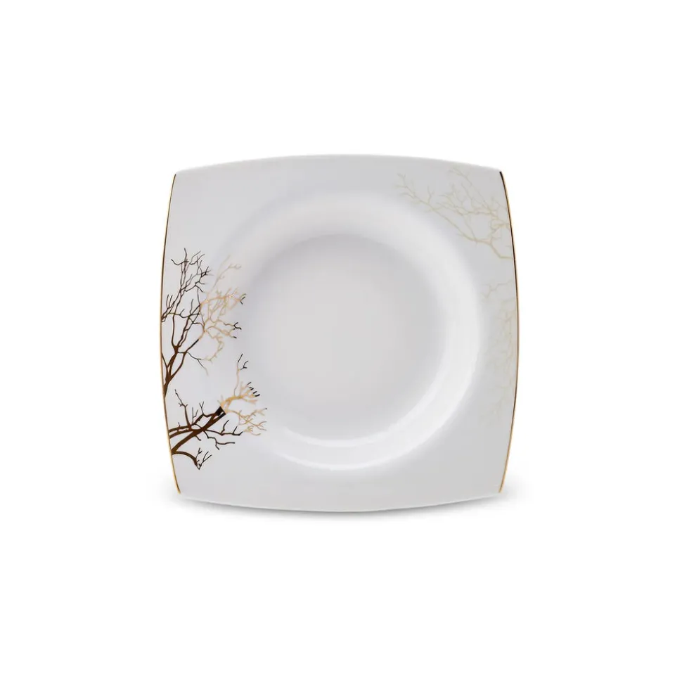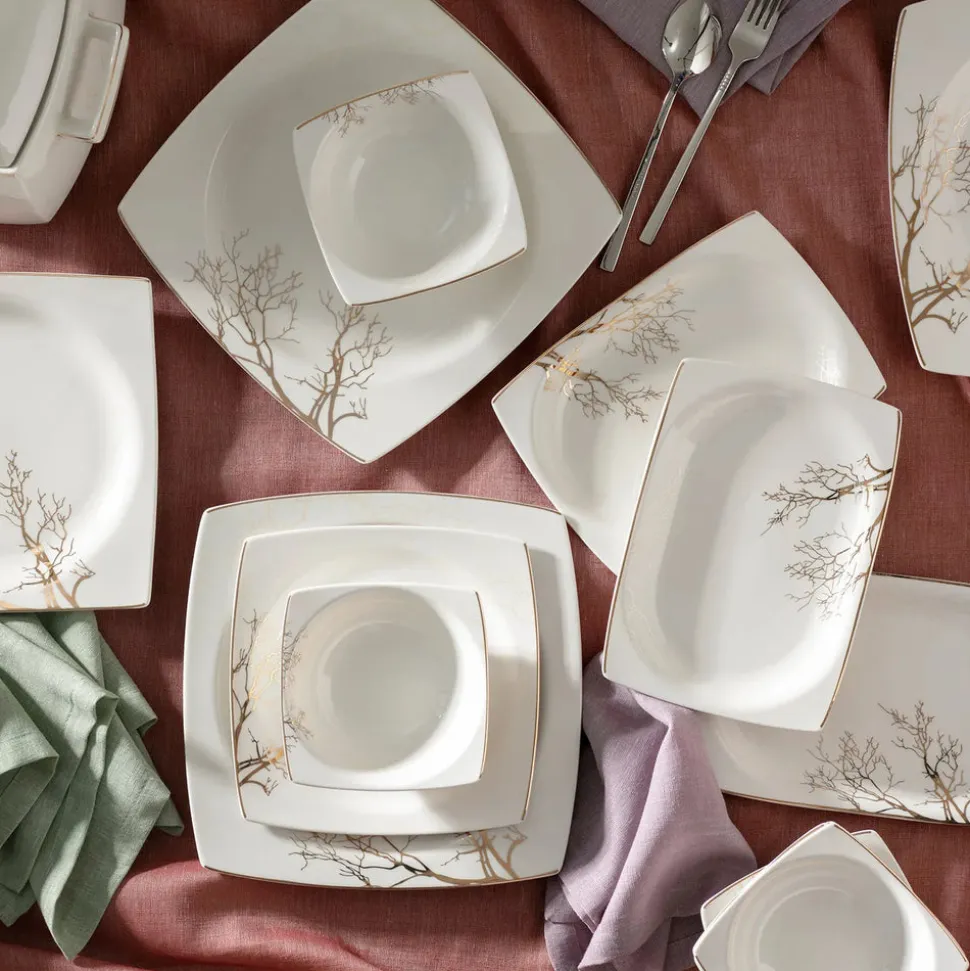 Rund, oval oder eckig? Der Formenvielfalt ist bei Geschirr nahezu keine Grenze gesetzt. Wer geometrische Formen bevorzugt und auch beim Anrichten auf eine klare Anordnung der Speisen Wert legt, wird das 60-teilige Tafelservice für 12 Personen aus der Autumn-Cream-Serie von Karaca lieben. Leicht nach außen gebogene, goldene Kanten, die an den Ecken spitz zusammenlaufen sind das charakteristische Merkmal, dass bei diesem eckigen Kombiservice sofort ins Auge sticht. In Kombination mit den filigranen, goldenen Mustern und Rändern, die an Korallen und Bäume erinnern, ist dieses Porzellan zeitlos und modern zugleich.