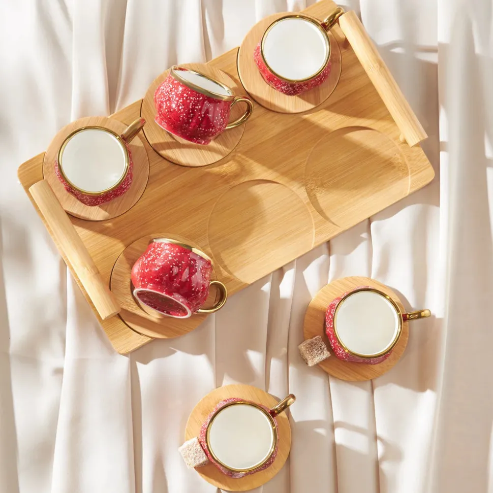 Karaca Bambus Rot Kaffeetassen-Set 90 ml, 6 Personen, mit Tablett