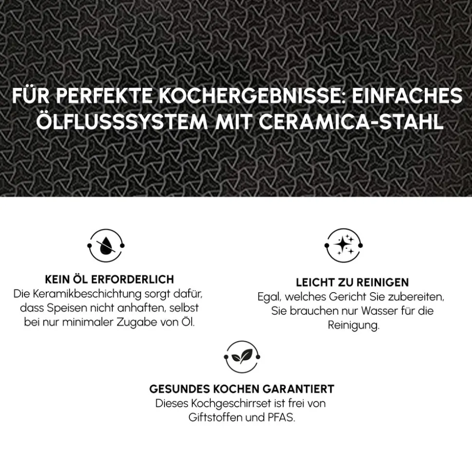 Die innere Keramikschicht bietet höchste Kochleistung – selbst bei minimalem Öl bleibt nichts haften. Die Edelstahl-Außenseite ist langlebig und behält stets ihren Glanz wie am ersten Tag. Die robusten Glasdeckel sind hitze- und stoßfest.
