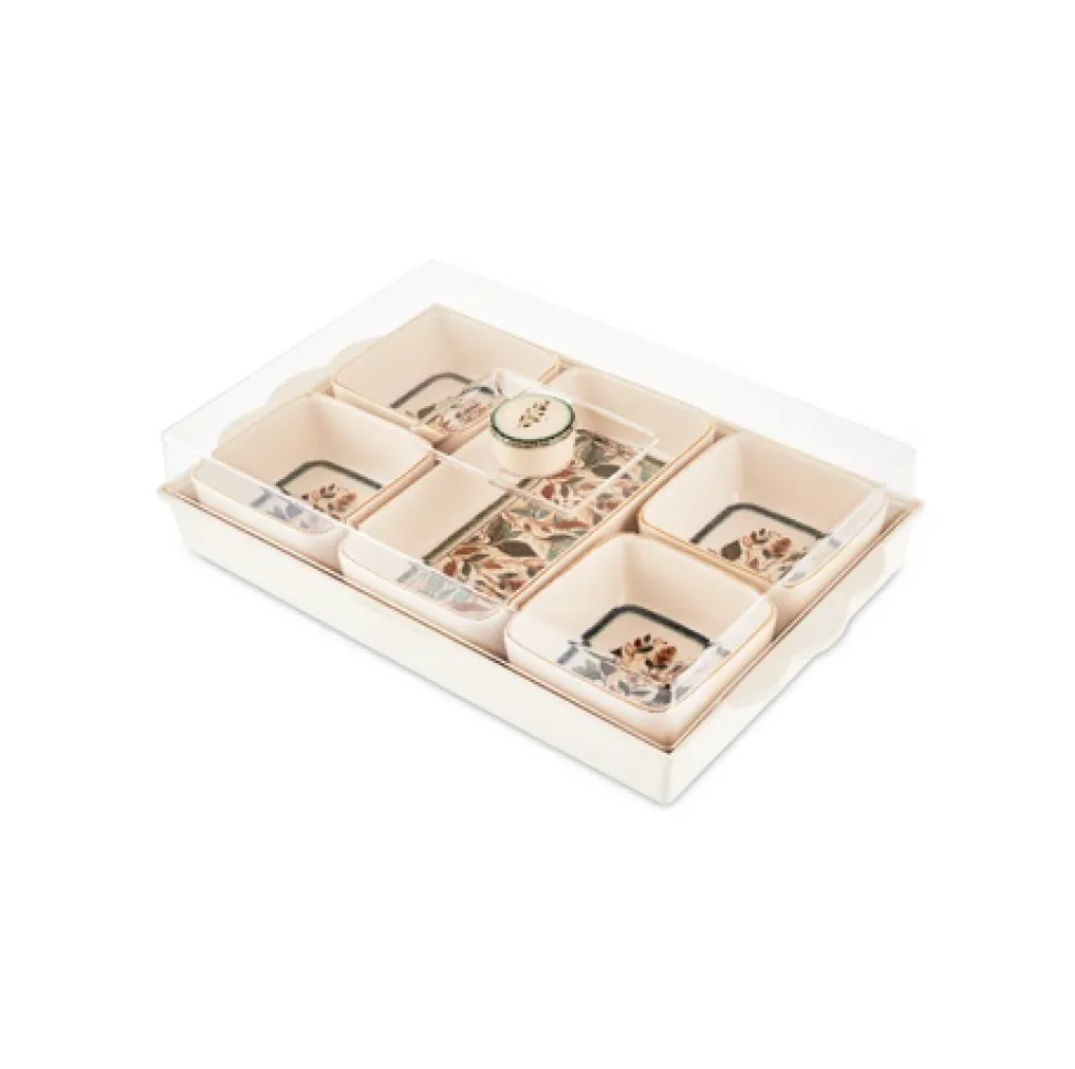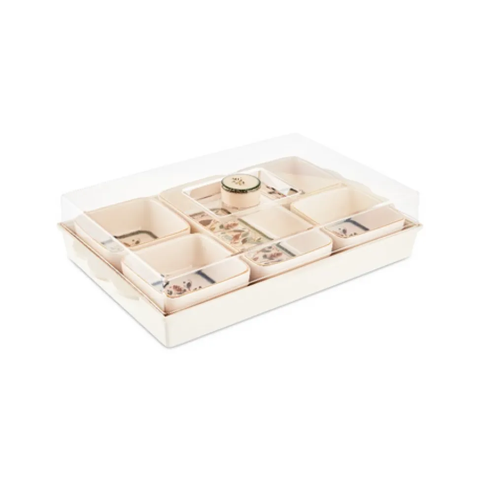 Gefertigt aus strapazierfähiger Keramik bietet jedes Stück einen modernen und zugleich zeitlosen Look. Das passende Tablett mit Deckel hält Ihre Speisen frisch und ansprechend präsentiert, während die Schalen und die Servierplatte perfekt zum Anrichten verschiedener Köstlichkeiten geeignet sind.