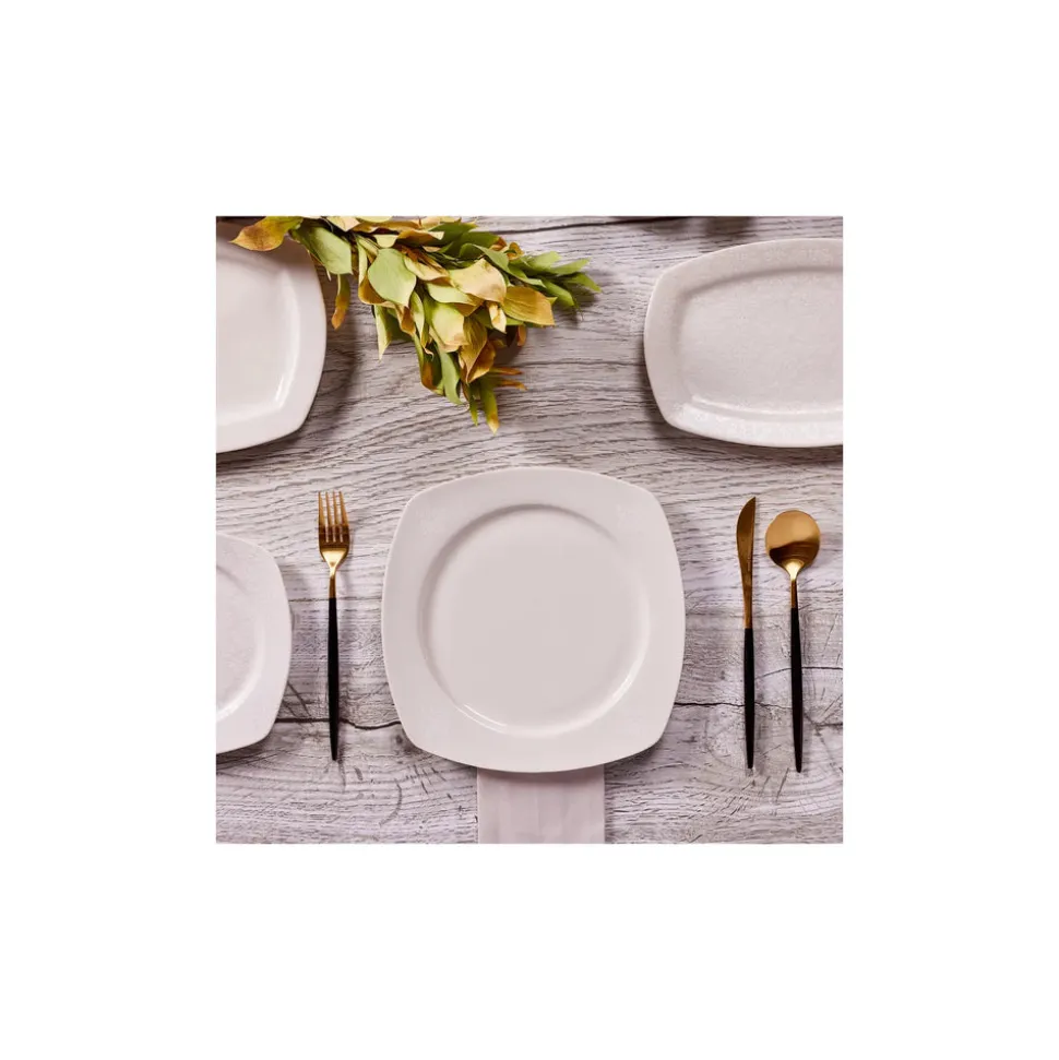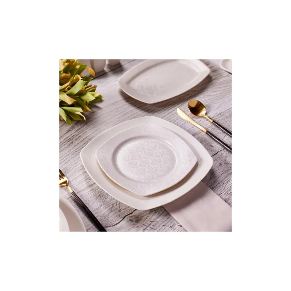 Nicht umsonst ist dieses Tafelservice ein Bestseller in unserem Sortiment. Das 57-teilige Geschirrset besticht durch sein außergewöhnliches Design und ein unschlagbares Preis-Leistungs-Verhältnis. Gefertigt aus hochwertigem Porzellan, ist dieses quadratische Geschirr mit abgerundeten Ecken robust und langlebig. Das dezente Dekor mit erhabenem Blumenmuster wertet das Kombiservice optisch auf und wird so zu einem Hingucker auf jeder Tafel.
