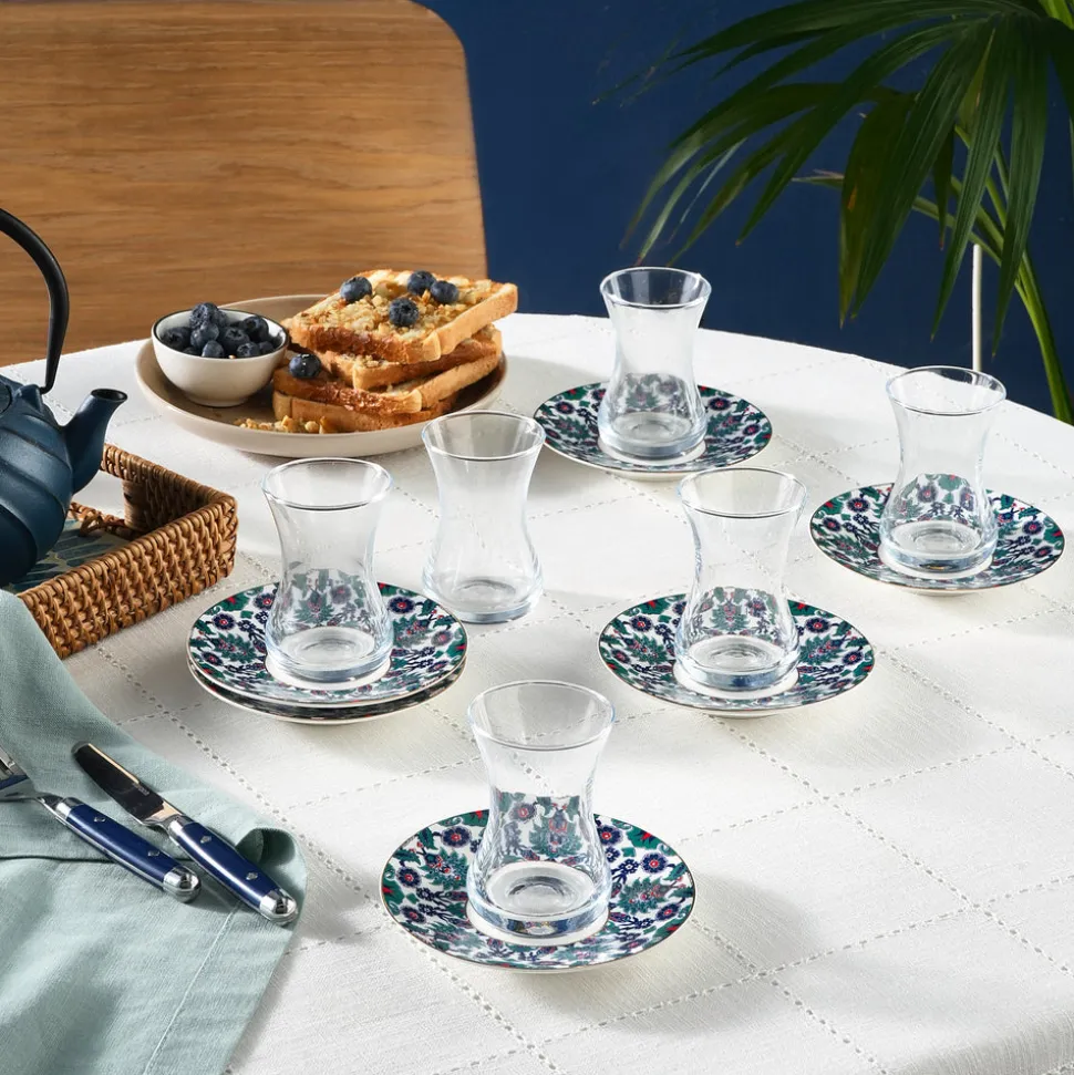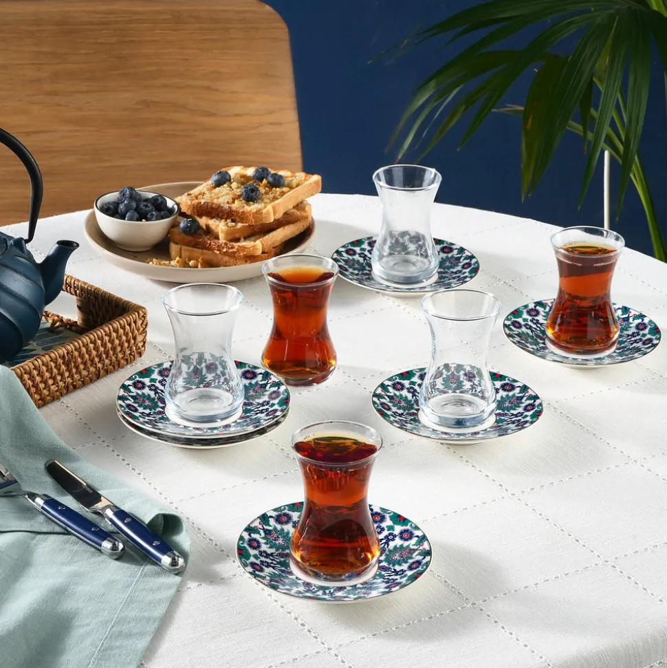 Karaca Edirne 12-teiliges Bone-China Türkisches Teeset für 6 Personen, 130 ml, Mehrfarbig